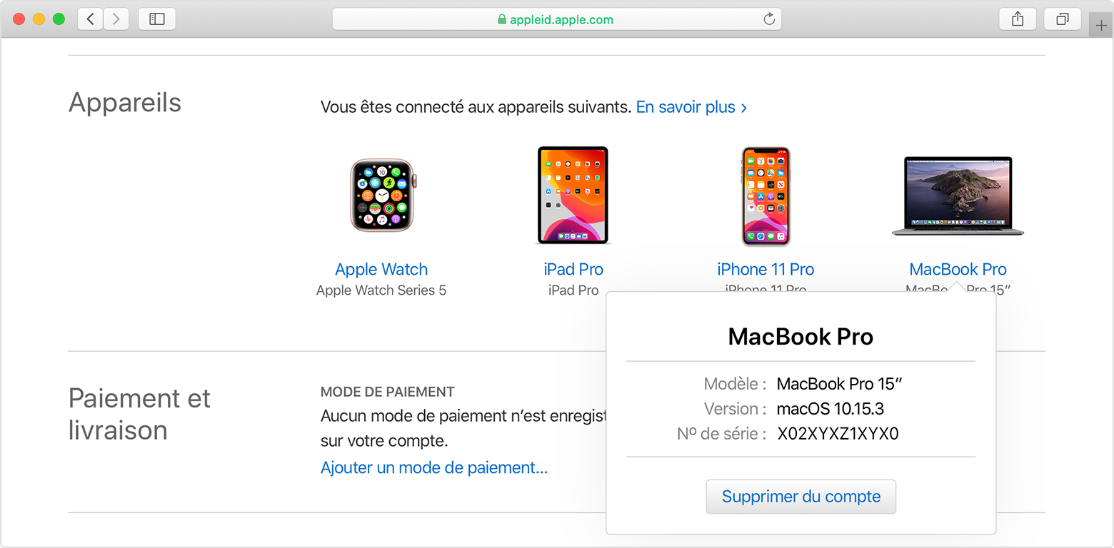 Vous pouvez supprimer des appareils à partir de la page de l’identifiant Apple :