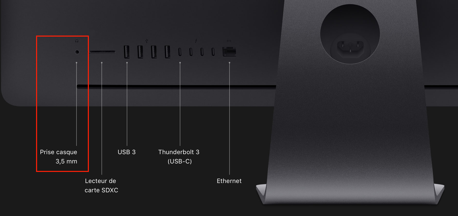 Si je prends l'exemple de l'iMac Pro cité dans ta configuration, tu peux trouver un port jack 3.5mm à cet endroit derrière l'écran de ta machine :