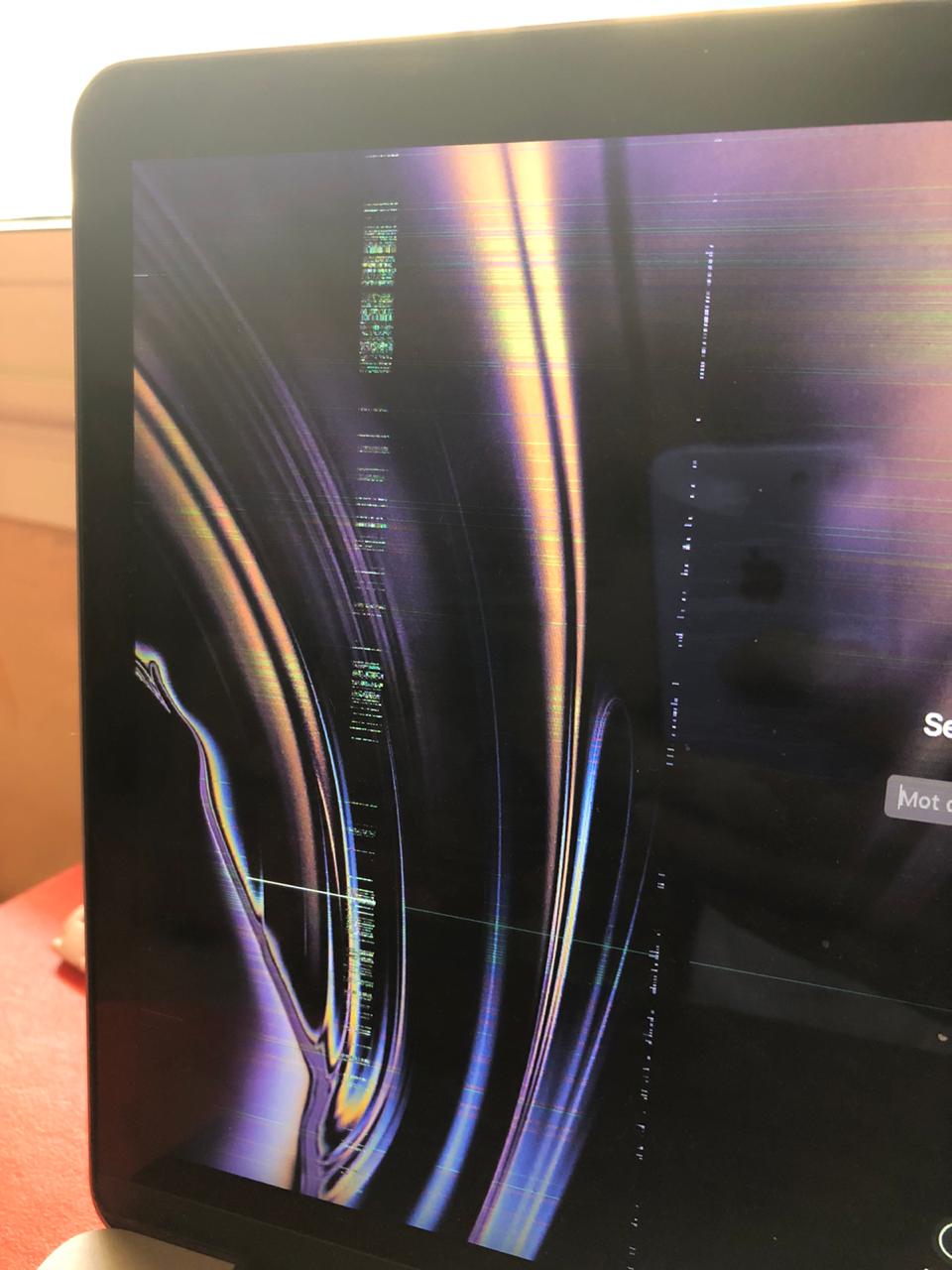 Depuis peu, des lignes horizontales tremblotantes roses et vertes sont apparues sur l'écran de mon MacBook. Je ne pense pas que le problème soit dû à l'écran, puisque l'affichage peut être parfait dans certaines positions d'inclinaison de l'écran. Par ailleurs, aucune ligne n'apparaît lorsque je prends un screenshot ou connecte mon ordinateur à un écran externe. Il doit donc sans doute s'agir d'un problème de câblage. Je vous joins une photo de l'écran. Quels seraient donc les problèmes et quelles éventuelles pièces serait-il possible de changer?