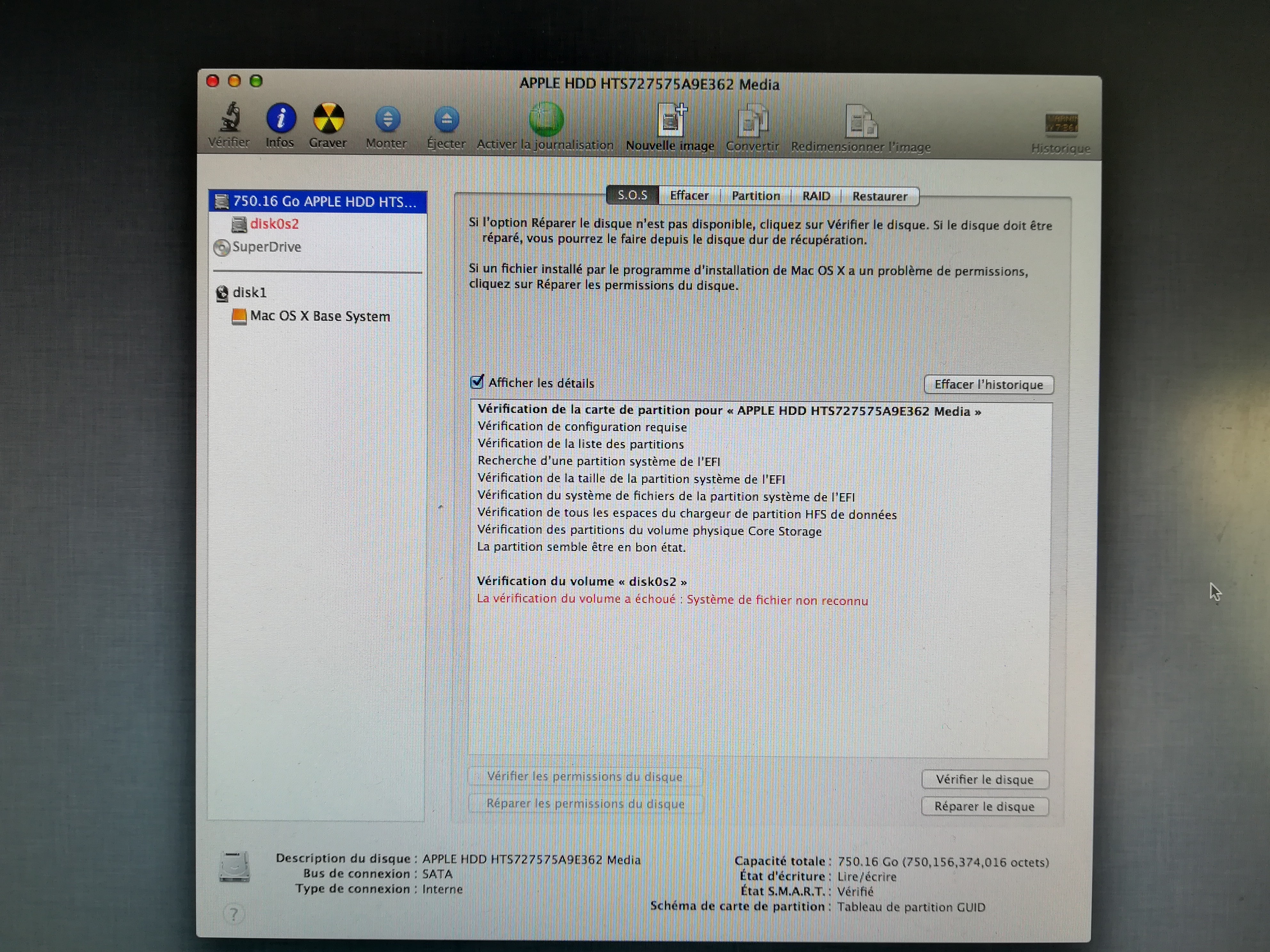 . Lors de la vérification du volume (cmd+R), le disk0s2 comporte un système de fichier non reconnu.