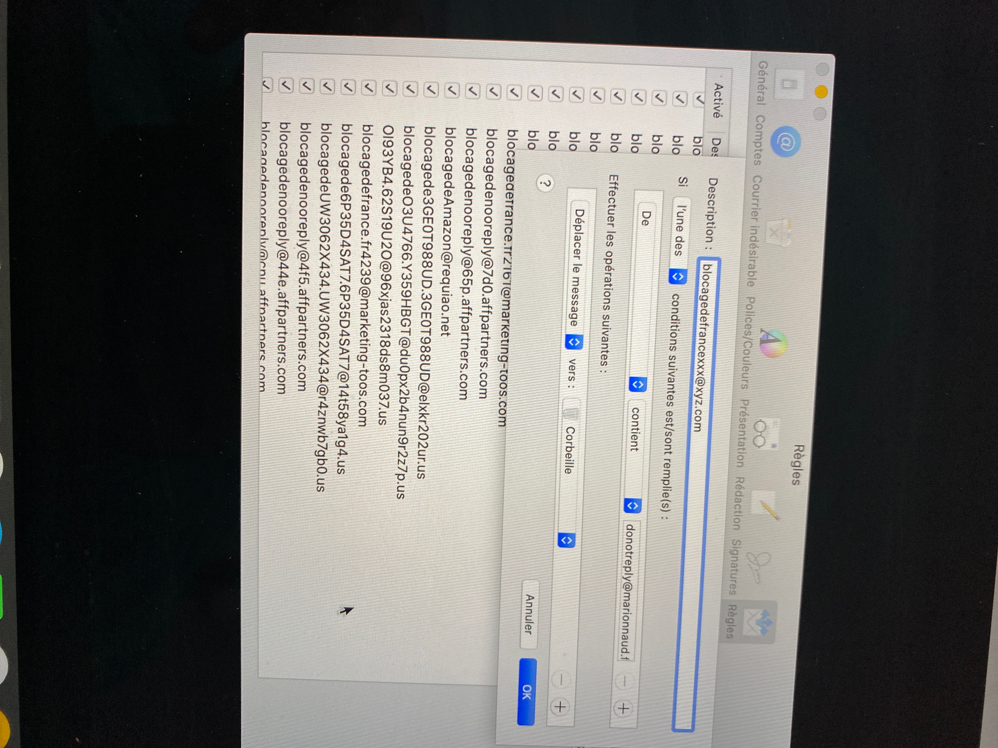 Bonjour et surtout merci ! Effectivement je vais me pencher sur la sauvegarde Time Machine! Par contre voici ce que j’ai fait pour bloquer : déjà sur l’adresse des expéditeurs de spam on peut plaquer le correspondant mais cela ne sert pas à grand chose à part me dire qu’il est bloqué 😜 ! Je suis allée dans Mail / préférences/ règles /ajouter une règle et écrire en copiant l’adresse de l’expéditeur : exemple : blocagedefrancexxx@xyz.com