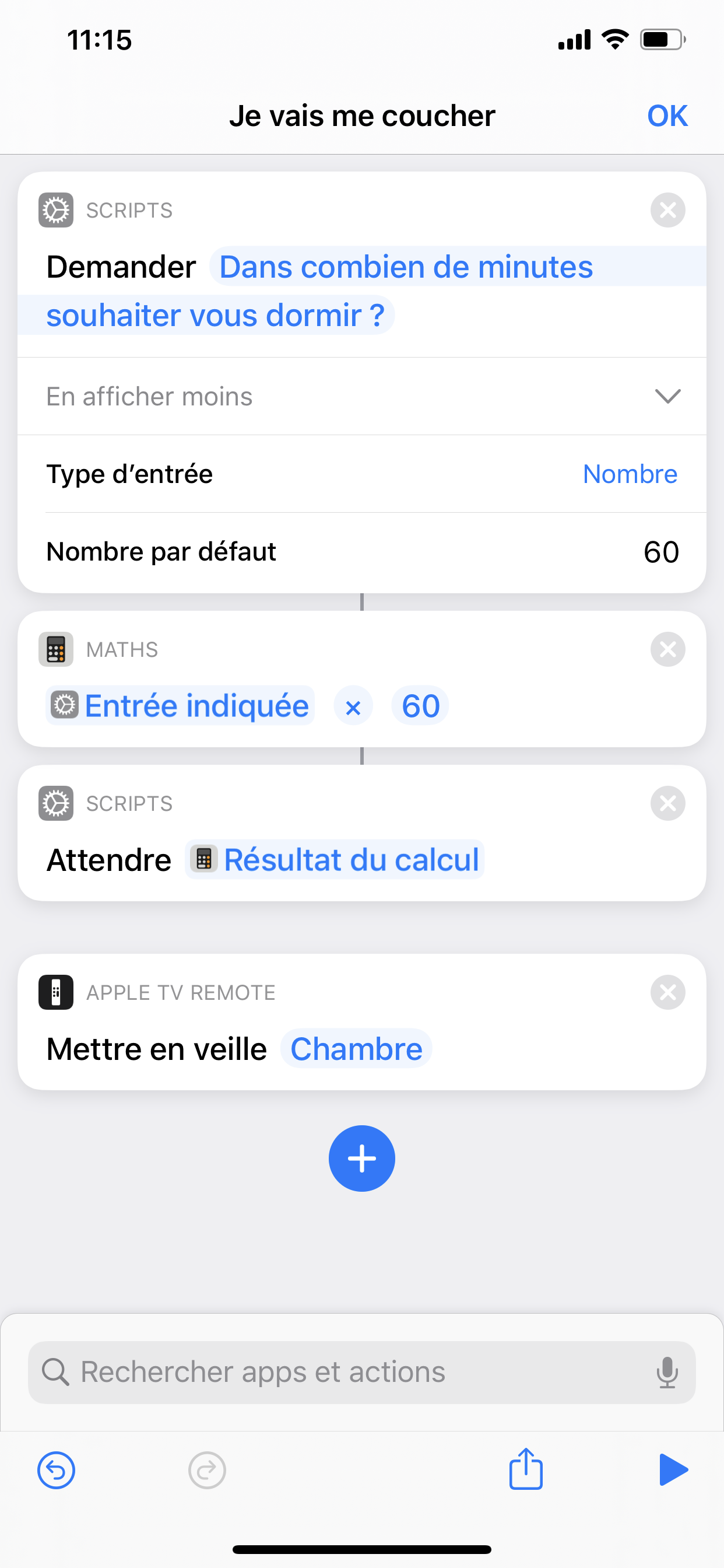 J’ai essayer d’utiliser le script attendre mais cela ne me propose que des secondes. J’ai donc essayé de rusé en faisant un calcul tout bête. Super !! Je pensais avoir réussi mais non. Cela fonctionne manuellement en utilisant l’iPhone mais dès lors où on demande à Siri, il ne comprend pas 10 mais dix, ou bien 20 mais vingt et du coup cela fait une erreur.