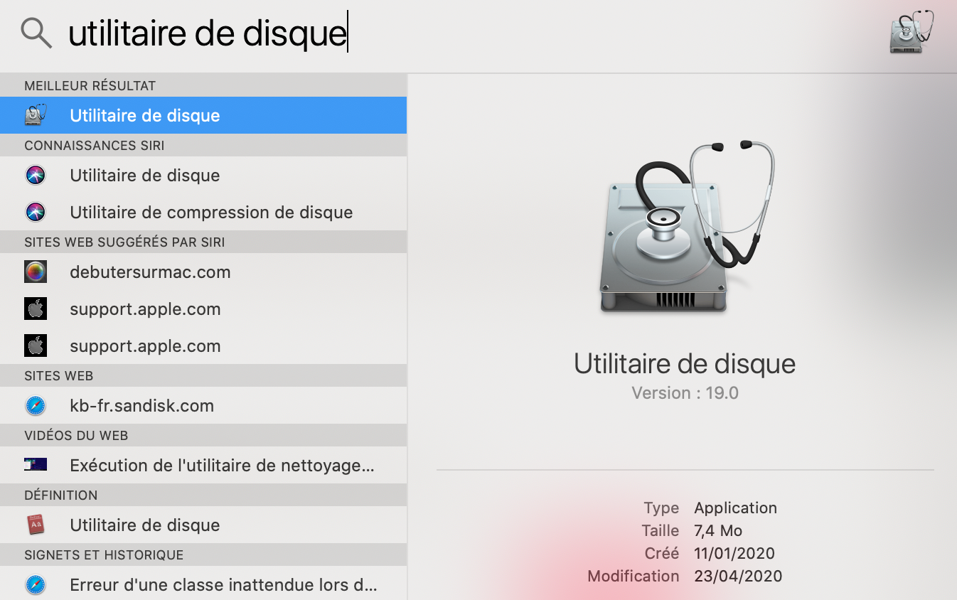 - Toute dernière chose, rendez-vous dans l'utilitaire de disques avec la recherche Spotlight (la loupe que tu as utilisé tout à l'heure pour le moniteur d'activité) :