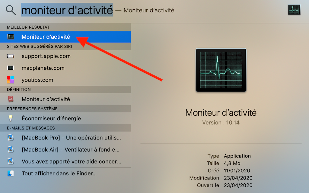 - Rends-toi dans la recherche Spotlight : il s'agit de la petite loupe que tu peux trouver en haut à droite de ton écran. Tapes-y : "moniteur d'activité", puis lance le moniteur, comme ci-dessous :
