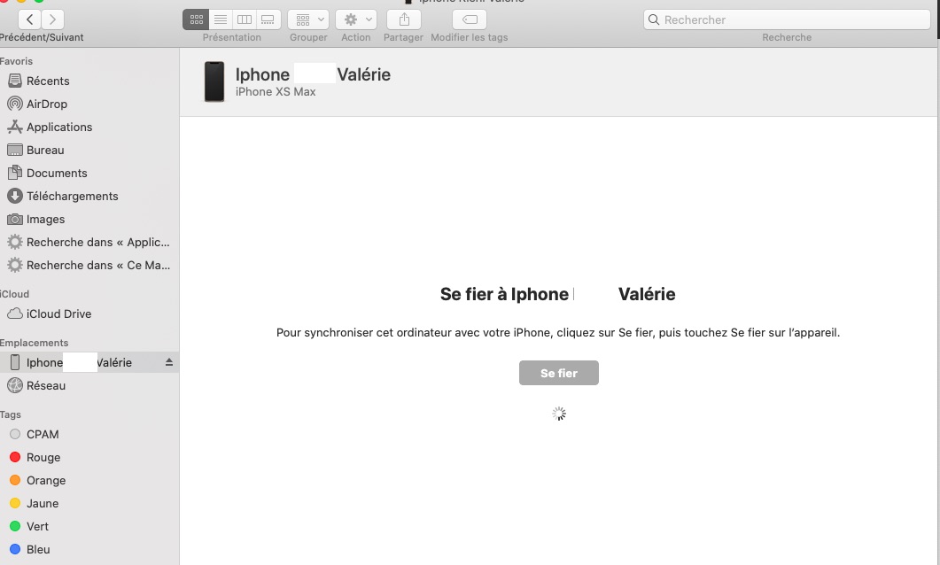 Lorsque je veux synchroniser mon Iphone XS MAX via le Finder après avoir branché mon Iphone, je clique sur se fier (voir ce message qui s'affiche) mais rien ne s'affiche sur mon Iphone. Comment faire ? Merci de m'aider. Valérie
