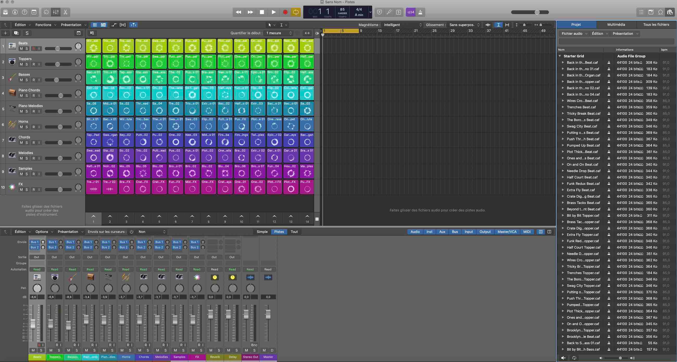Bonjour, vous parlez de quelle fenêtre? Si vous sélectionnez nouveau projet à partir d'un modèle / Grille de départ / Boom Bap Masher (premier modèle de la liste), votre Logic à t'il cette configuration comme sur la capture d'écran? Grille Apple Loops à gauche, fenêtre pistes arrangement au centre ( que j'ai activé) et liste des fichiers Apple Loops utilisés colonne de droite.
