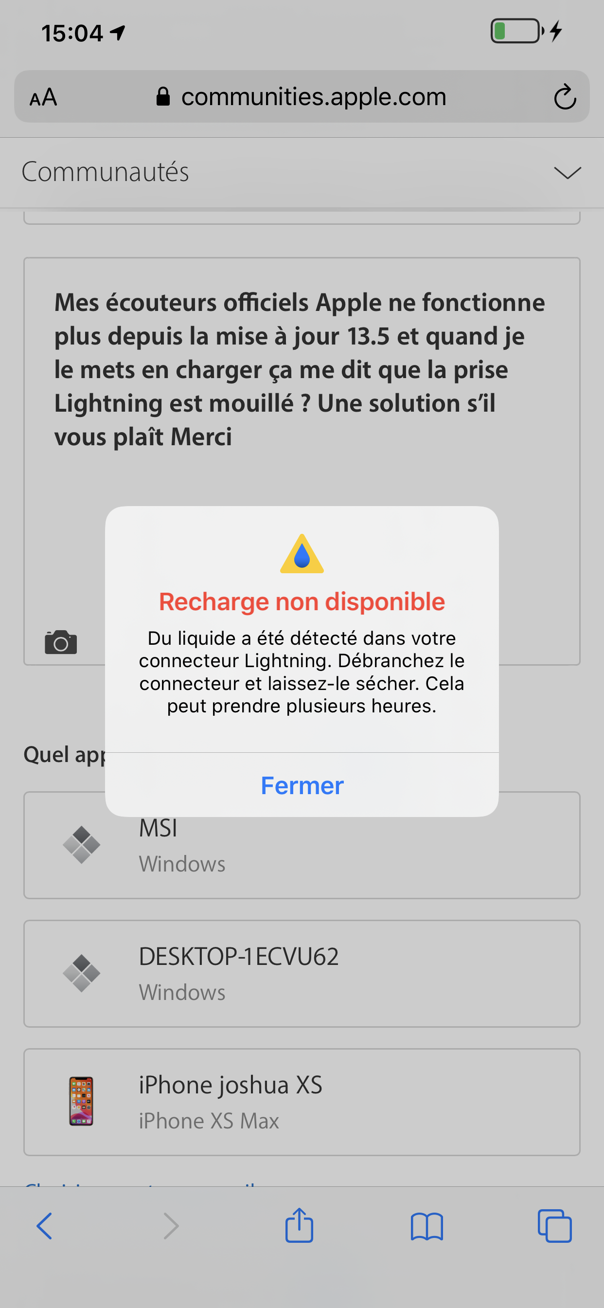 Mes écouteurs officiels Apple ne fonctionne plus depuis la mise à jour 13.5 et quand je le mets en charger ça me dit que la prise Lightning est mouillé ? Une solution s’il vous plaît Merci