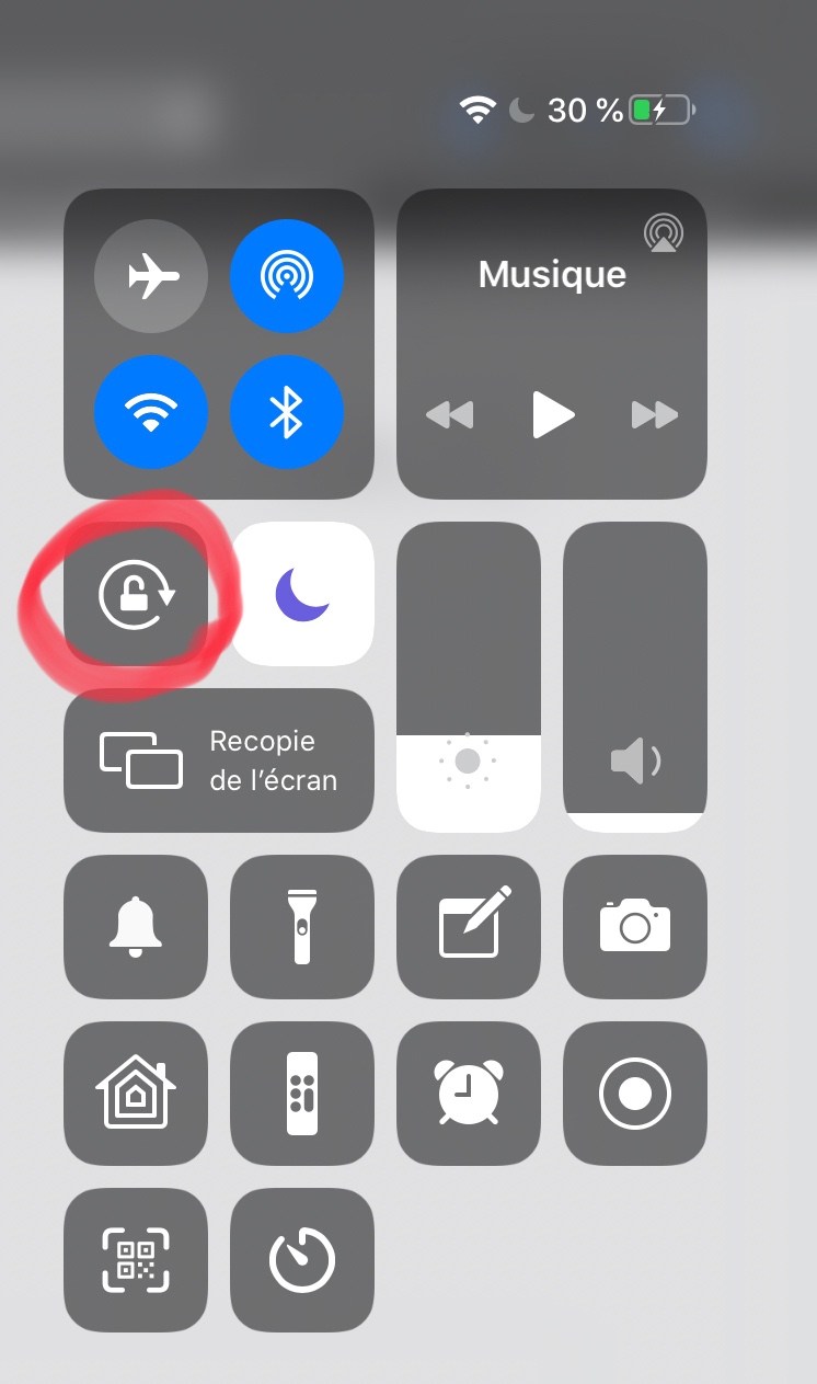 Pour tout rétablir, ouvrez le centre de contrôle en plaçant votre doigt sur l’icône de la batterie en haut à droite et en le faisant glisser vers le centre de l’écran. Vous devriez avoir un panneau similaire à la capture d’écran suivante :
