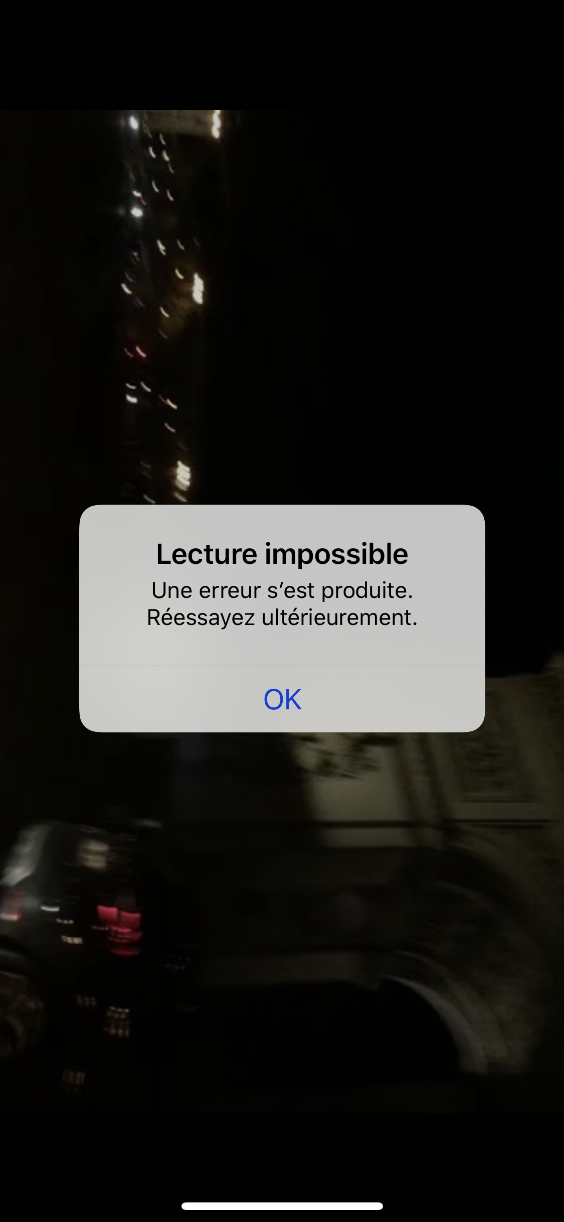 Depuis quelques temps je ne peux pas regarder d’anciennes vidéos prises sur mon iPhone même. Je ne les ai pas téléchargé ou autres. Un chargement apparaît puis se transforme en point d’exclamation. Le message est : « impossible de lire la vidéo. Une erreur s’est produite. Réessayer ultérieurement. ». Rien n’y fait. Sur un autre forum la solution était d’enlever le mode d’économie d’énergie. Ça ne marche pas... que faire?