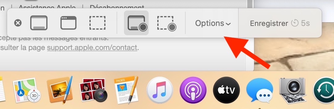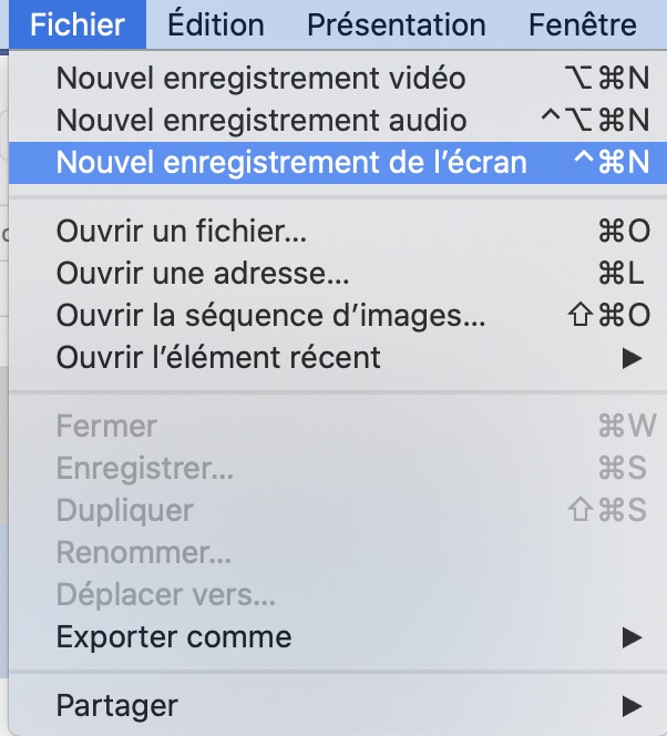 quand tu clic sur "fichier" > nouvel enregistrement de l'écran, tout en bas de ton écran il y a une petite fenêtre flottante qui s'affiche ou tu as tous les réglages pour faire plein écran sélection et les réglages. C'est ici qu'il faut regarder et dans la barre d'état en haut un petit point pour arrêter l'enregistrement