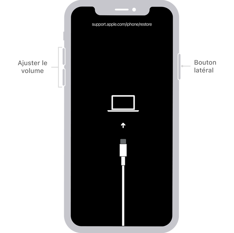 Mon iphone 8 reste bloqué sur l'ecran où il un cordon et ecran blanc