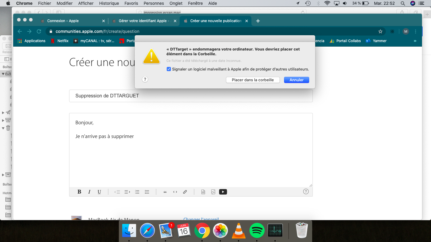 Je n'arrive pas à supprimer le logiciel malveillant DTTARGET. J'ai tout suivi des indications vues sur internet, mais impossible de trouver le logiciel dans les applications etc... Le message d'alerte du mac s'affiche sans cesse mais ne place pas le logiciel dans la corbeille et il revient non stop.