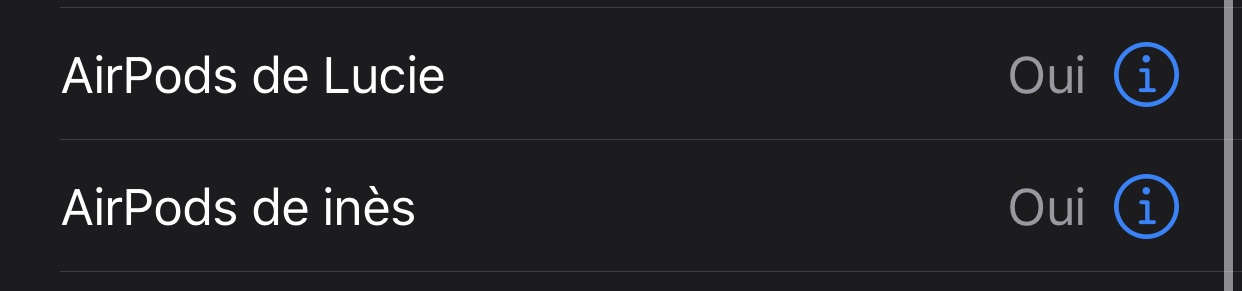 Bonjour je rencontre un souci au niveau de la connexion de mes AirPods deuxième génération. Avec les aipods de mon amid nous avons tenté de les connecter Ensemble à fin de pouvoir écouter la même musique en même temps. Or je pense qu’il y a eu un souci et qu’en faisant cela ça a déréglé mes AirPods car On me dit que mon AirPod droit est à mon nom et le AirPods gauche est au nom de mon ami. Donc forcément je ne peux pas écouter la musique en même temps de chaque côté. Bien sûr avec mon amie Nous avons regardé si nous nous étions pas trompé de AirPods, Si on avait pas échangé sans le faire exprès. Puis elle n’a aucun problème de son côté. Donc je pense que cette manipulation a peut-être déréglé un de mes AirPods