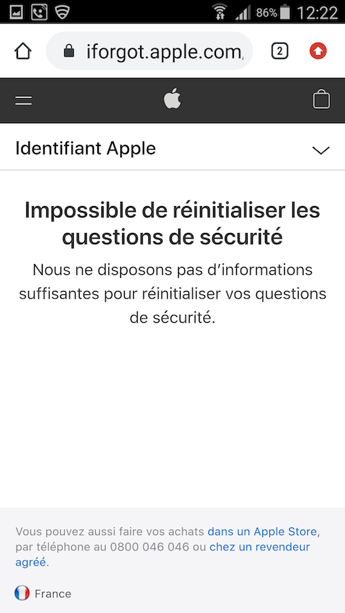 Bonjour à tous. Je n'arrive plus à accéder à mon identifiant Apple. Impossible de réinitialiser les questions de sécurité. Que faire ? Le mot de passe est correct.