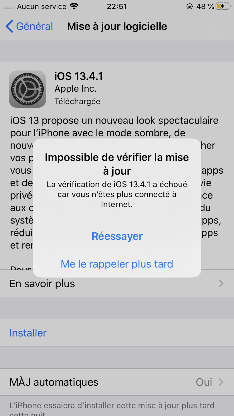 message d’erreur : la vérification de ios13.4.1 a échoué car vous êtes plus connecter à internet