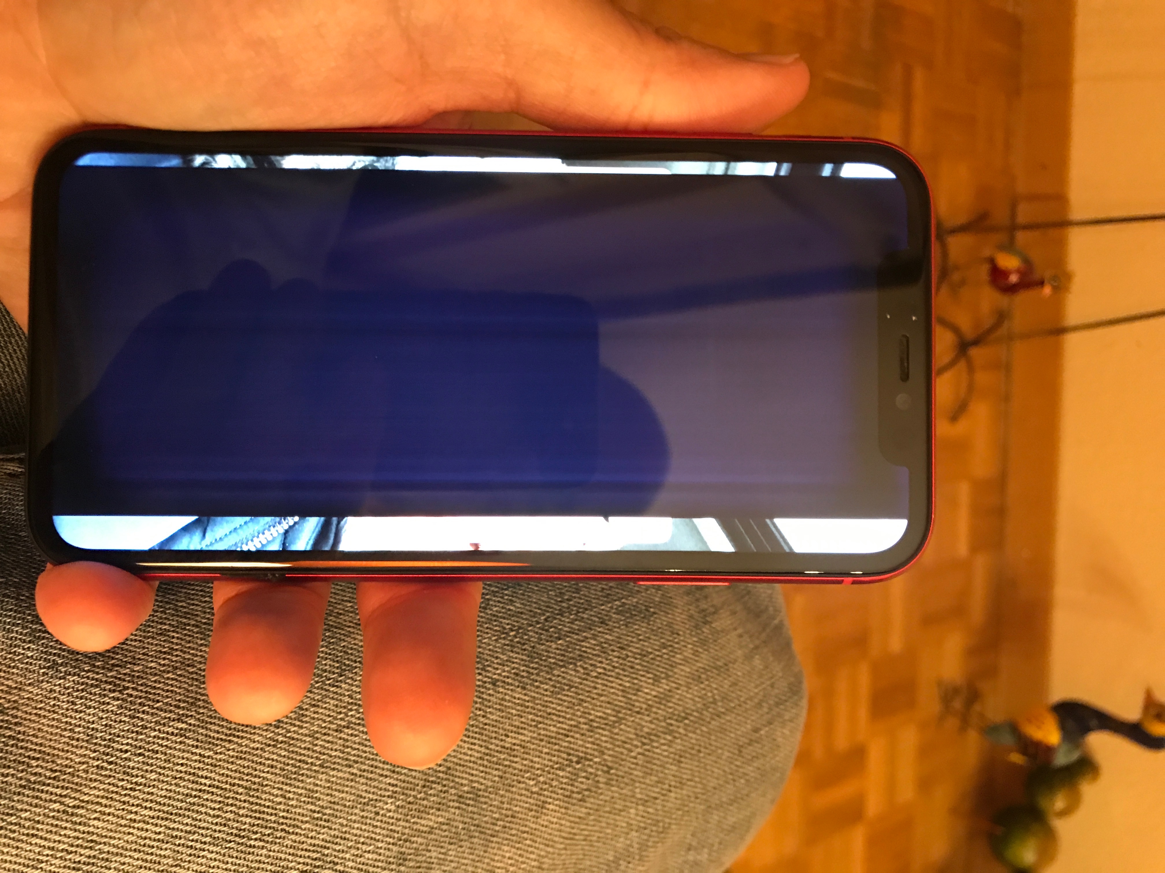 Écran avec une large bande noir et qui passe au blanc au centre de l’écran sur un iPhone 11 rouge