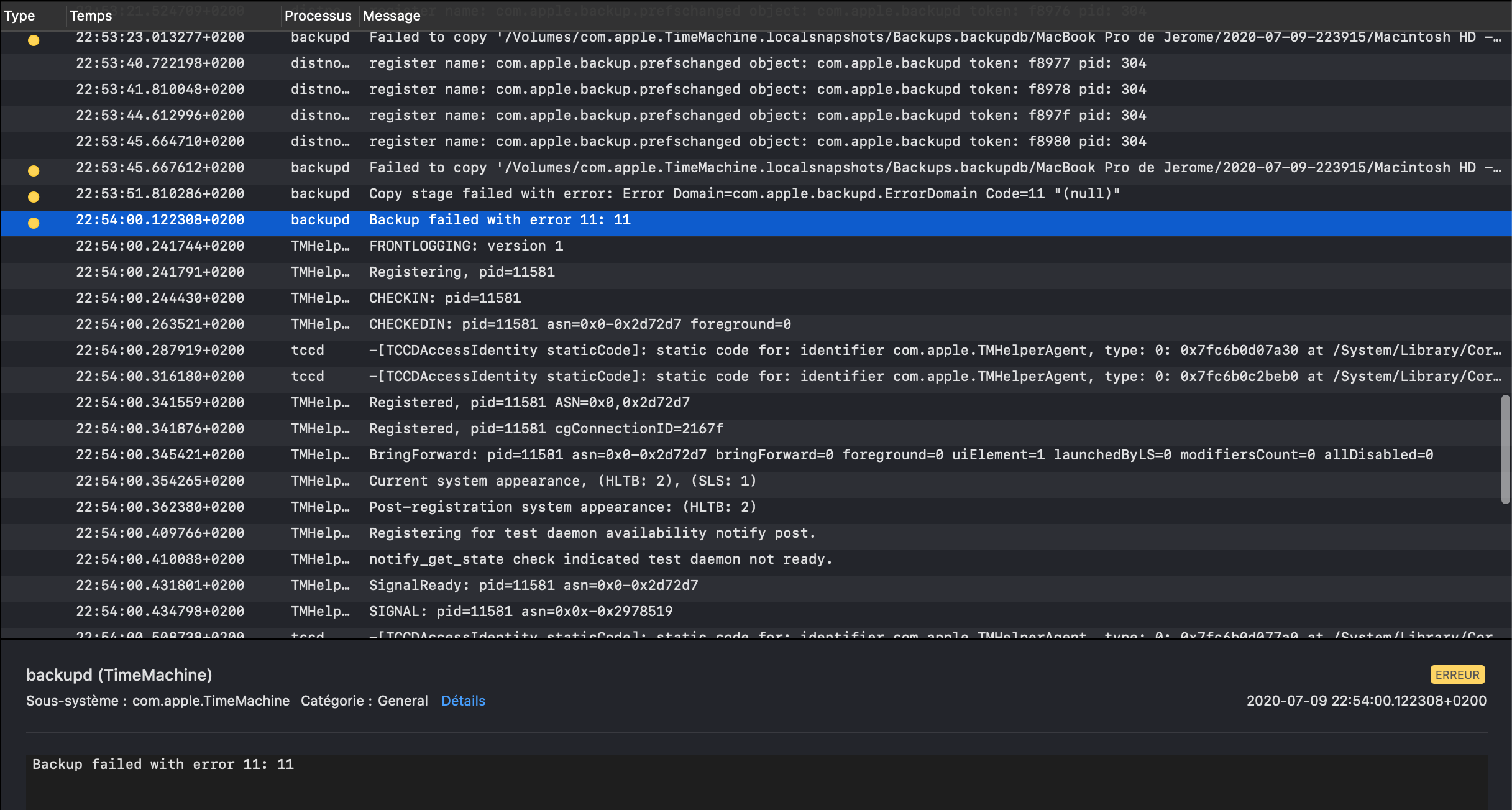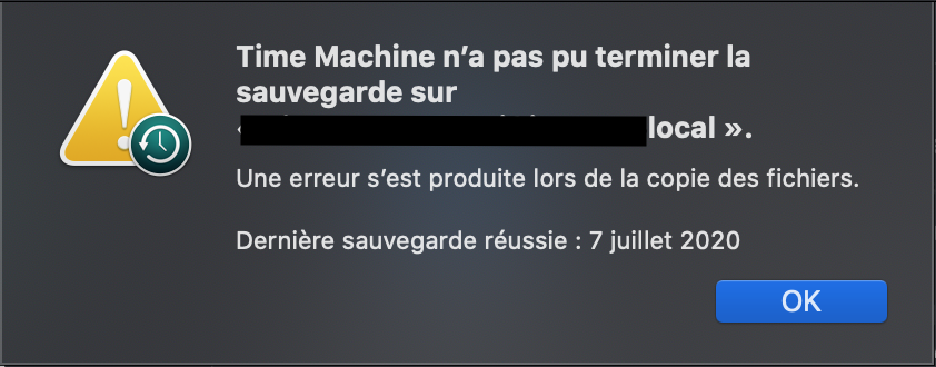 Le message de TimeMachine n'est pas très précis et ressemble à ceci :