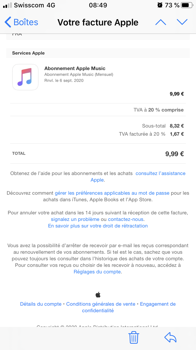 Bonjour je viens de recevoir une facture de 9,99€ pour un abonnement Apple Music alors que je l’ai retiré avant la fin de l’essai gratuit... comment me faire rembourser et arrêter Apple Music convenablement?! Merci