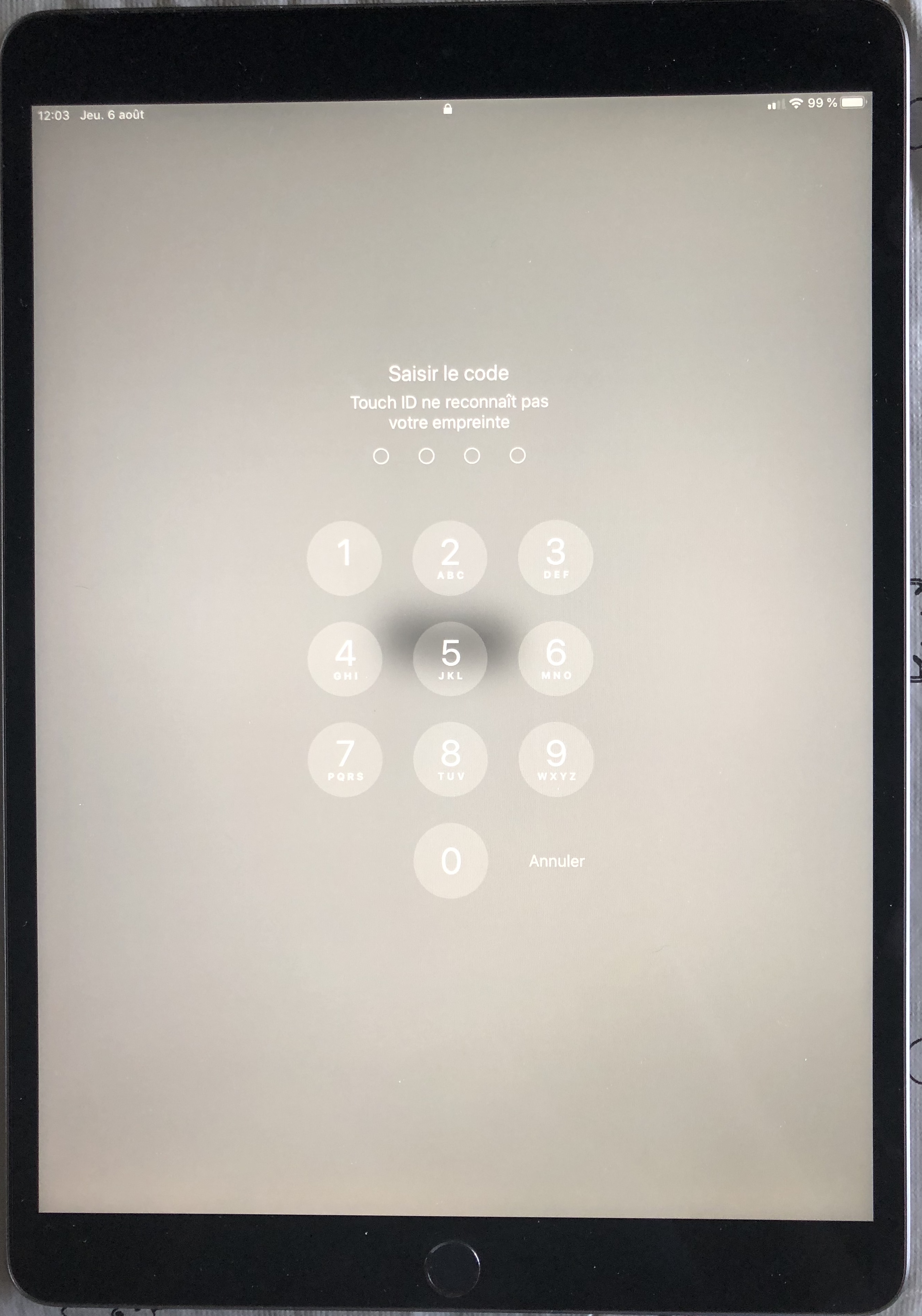 Vous parlez de la zone un peu plus sombre au niveau du 5? Cela provient de l’image qui se trouve en arrière plan et n’a rien d’anormal. Ce phénomène ne doit pas se produire lorsque vous déverrouillez votre iPad et que vous l’utilisez?