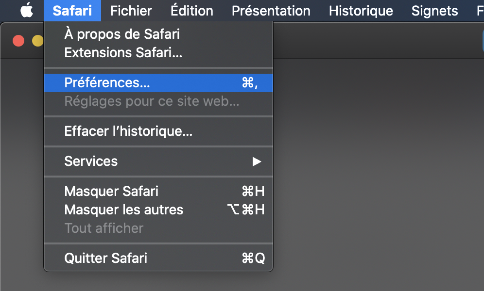 je ne trouve pas Safari Preference dans la barre de menu Safari