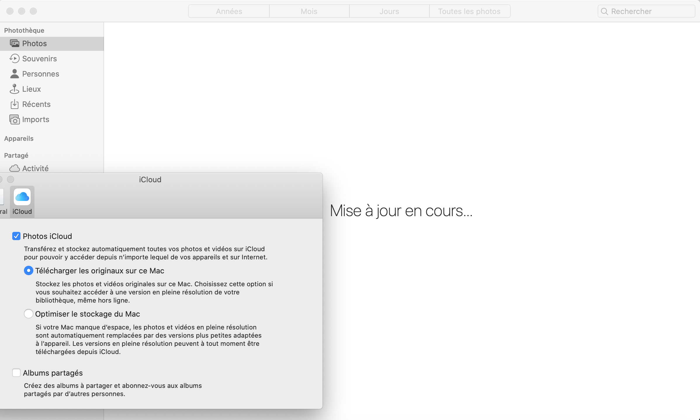 Et sur macOS (Catalina 10.15.6), dans les options de Photos, il y a bien la case Photos iCloud cochée, mais depuis 14h aujourd'hui, soit pendant plus de 8h, Photos est resté sur le message "Mise à jour en cours..."