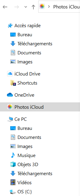 sur mon PC maintenant, il y a "iCloud Drive" et il y a "Photos iCloud" dans l'arborescence de Windows 10, identique à Documents, Images, Bureau etc ... (voir la PJ)