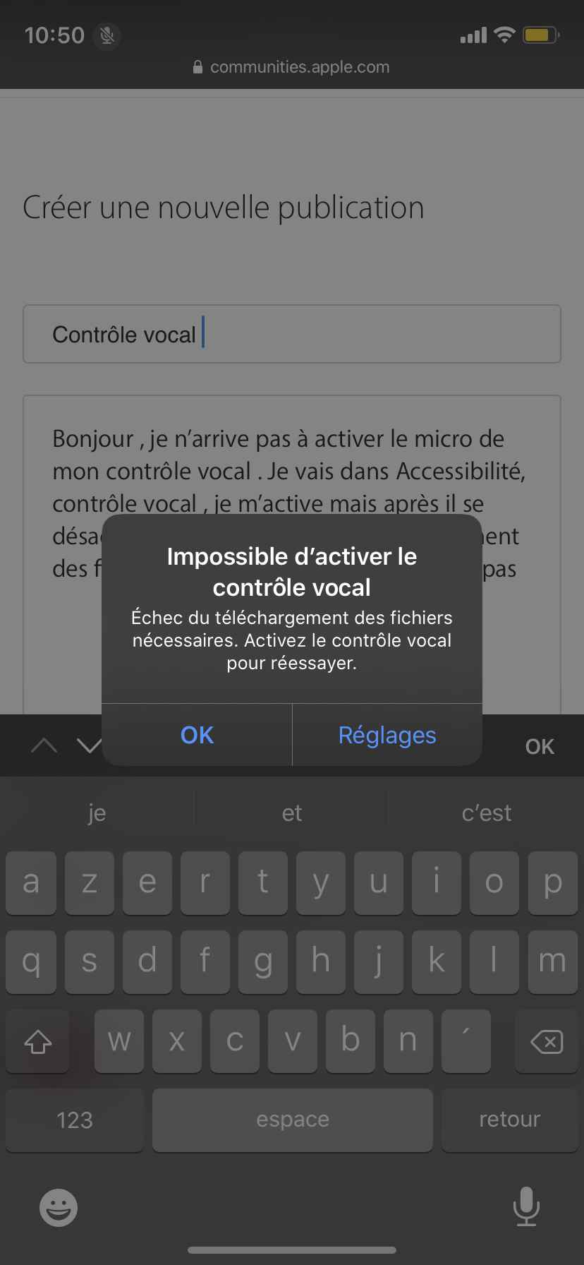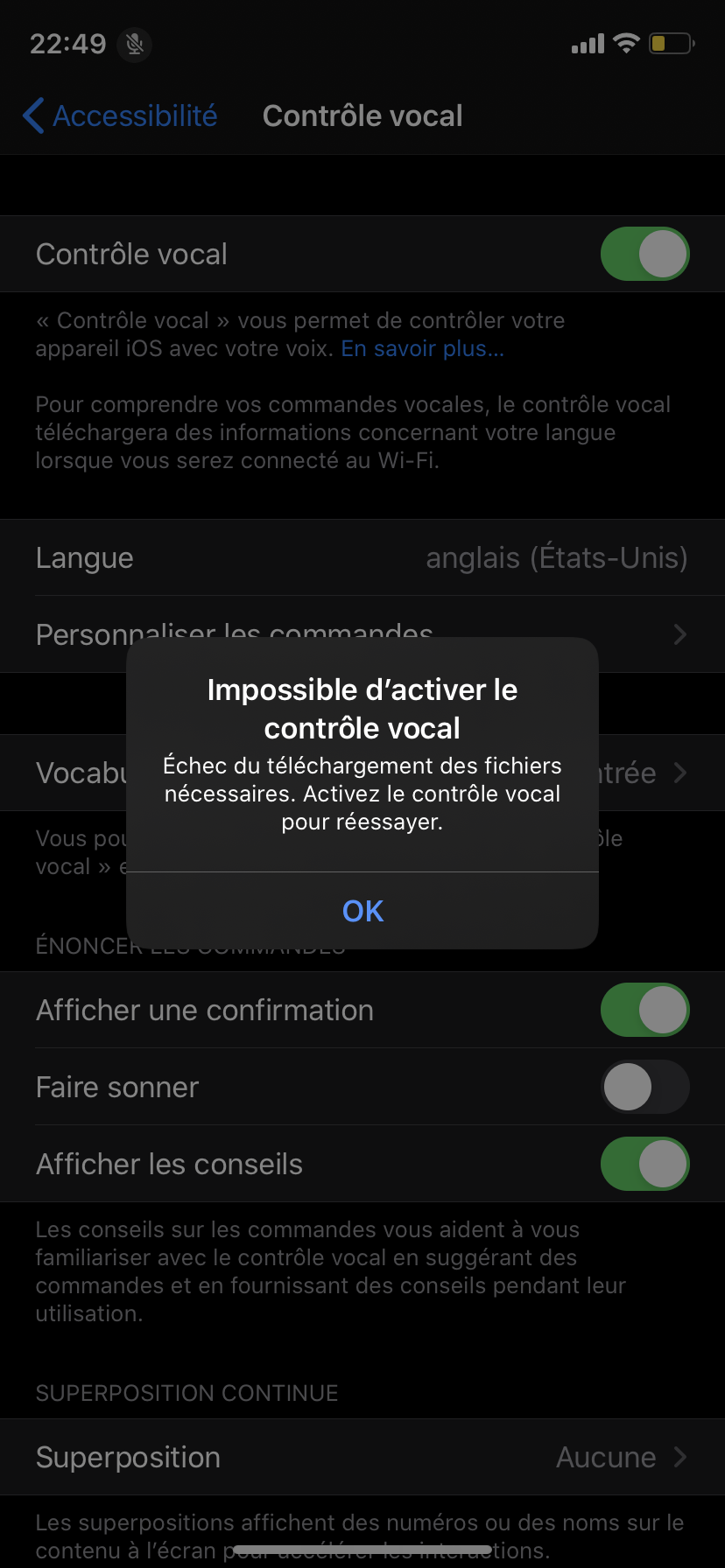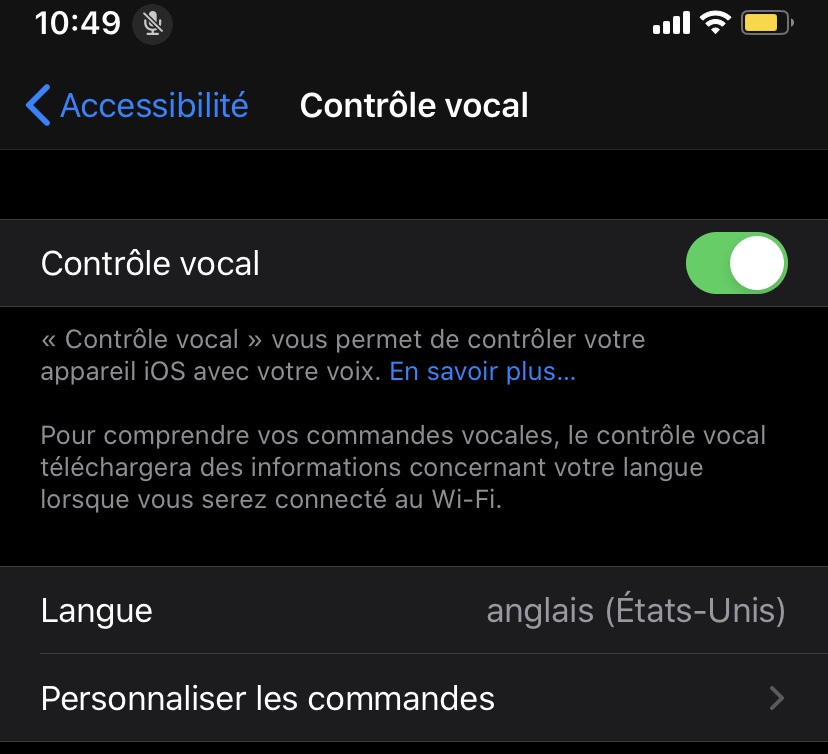 Bonjour , je n’arrive pas à activer le micro de mon contrôle vocal. Comme vous pouvez le voir sur la deuxième photo ci-dessous (à côté de l’heure le micro est barré) . Je vais dans Accessibilité, contrôle vocal , j’active mais après il se désactive et me dis échec du téléchargement des fichiers nécessaires (comme vous pouvez le voir sur la première photo ci-dessous) . Je ne comprends pas . Aidez-moi s’il vous plaît.