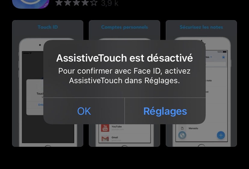 Lorsque tu vas dans Réglages > Accessibilité > Toucher > AssistiveTouch, tu pourras y voir l'option Confirmer avec AssistiveTouch apparaître tout en bas de cet écran. Est-ce qu'elle est activée chez toi ? Si c'est le cas, essaie de la retirer et de refaire l'opération. Elle permet simplement de définir AssistiveTouch comme moyen de confirmer un achat à défaut de devoir cliquer deux fois sur le bouton latéral.