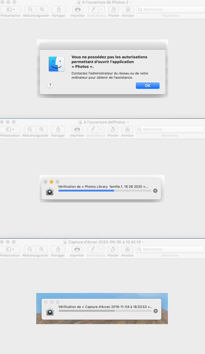 Bonjour, sur un Mac 27 Catalina 10 15 6 un photothèque ne s'ouvre pas et une fenêtre "vérification de "Photos Library ..." s'affiche avec un thermomètre de progression qui ne bouge pas (voir image jointe). Avez vous une solution, sachant que mes autres photothèques s'ouvrent.