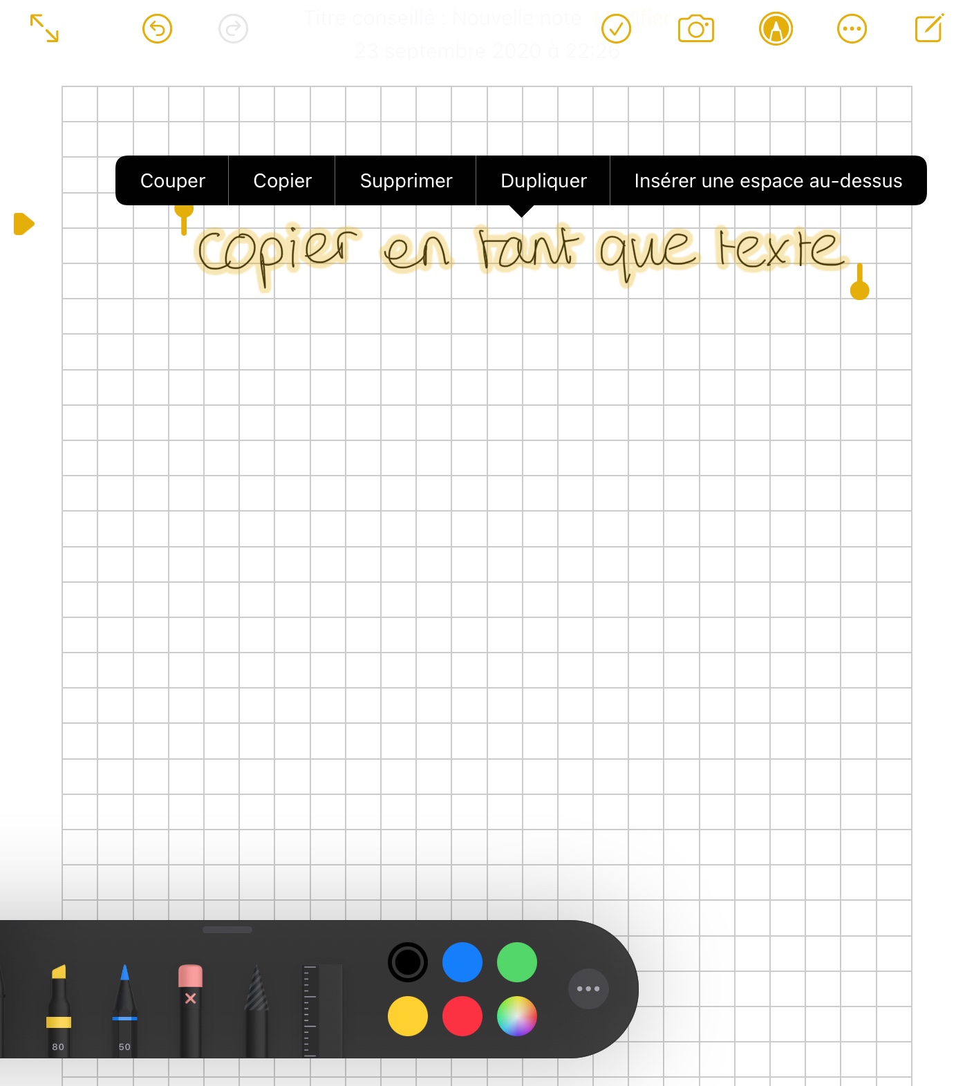 Bonjour, j’ai acheté l’IPad 8 et l’Apple pencil de première génération dans le but de pouvoir écrire mes notes manuscrites avec l’Apple pencil et de les « copier en tant que texte » sur une nouvelle page, hors ce mode ne s’affiche pas lorsque je sélectionne le texte. Je peux seulement copier traditionnellement mes notes. Alors s’il vous plaît, comment trouver la fonction « copier en tant que texte » ? Merci d’avance