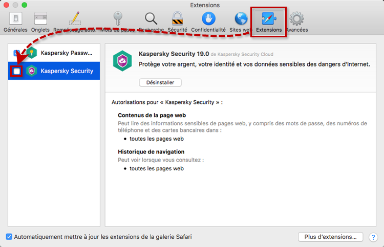 Je désire supprimer l'extension Kaspersky que je n'utilise plus et qui encombre mon Mac sans but. Comment procéder, s.v.p.?