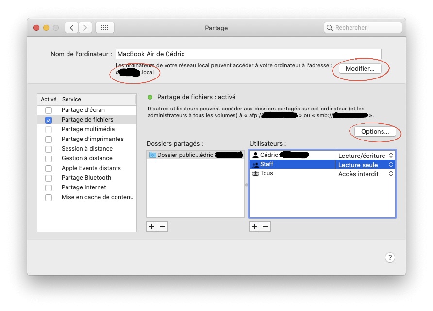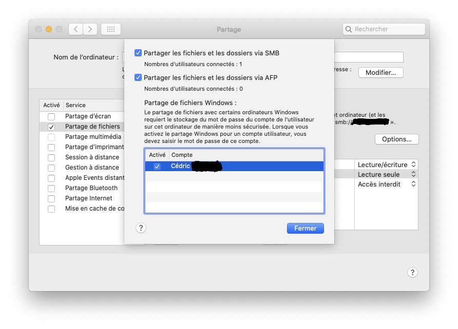 Ce matin, sur mon Mac 2008, dans Préférences système, Partage, Partage de fichiers, il est indiqué que l’accès aux fichiers peut se faire via smb ou afp.