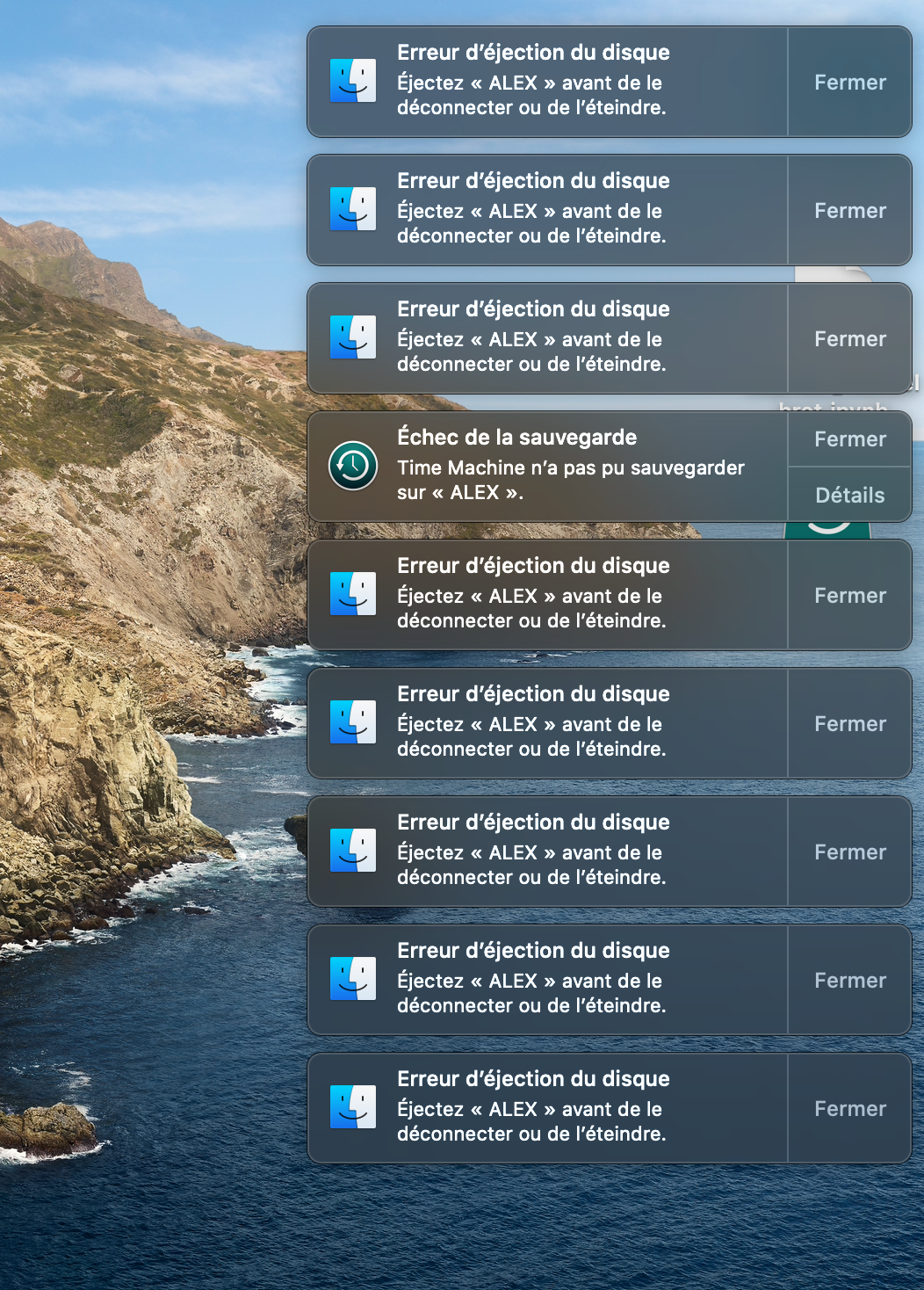 De plus après ce message, le DDE réapparait quasi-instantanément et la sauvegarde se relance... Après une nuit de "tentative de sauvegarde", j'avais presque 50 fois le même message du Finder "Erreur d'éjection du disque".