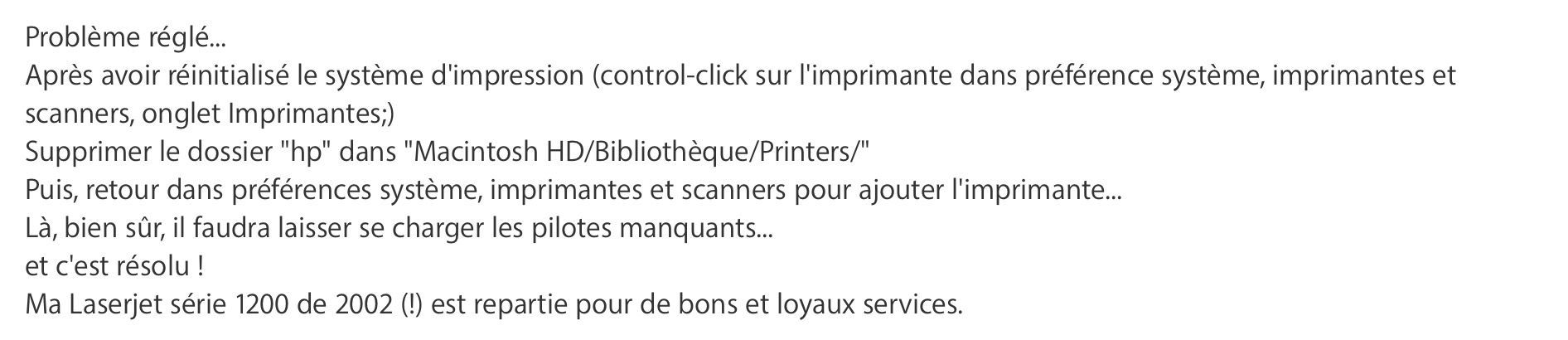 J'ai une imprimante HP connecté avec mon iMac , et subitement hier, sans que je fasse quoi que ce soit, je ne peux plus imprimer , le logiciel du pilote d'impression est soi)-disant corrompu, j'ai donc téléchargé sur le site de HP le logiciel de ce pilote et relancer le tout. Même problème. Après plusieurs communications via le forum d'entraide de la communauté Apple, il semble bien qu'il y ait un bug et ce depuis votre dernière mise à jour de OS Catalina. Jusqu'alors je pouvais imprimer normalement, et pourquoi depuis, plus rien.