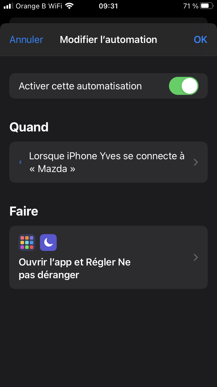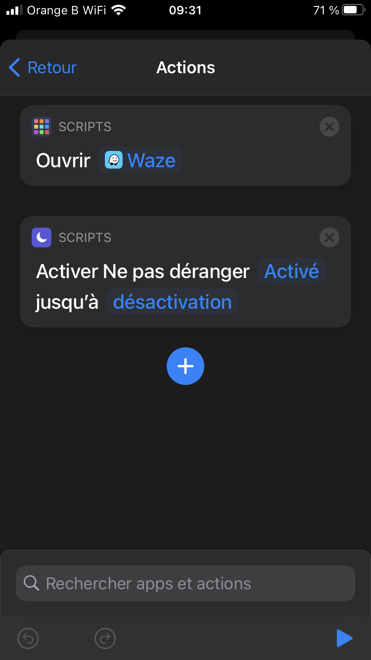 Je cherche comment activer le mode ne pas deranger en voiture a partir des possibilites proposees par l’app raccourcis. Seule la fonction ne pas deranger semble pouvoir etre definie comme action disponible lorsque par exemple mon telephone vient de s’appairer en bluetooth sur un equipement installe dans une voiture (mais pas carplay)... merci pour votre aide