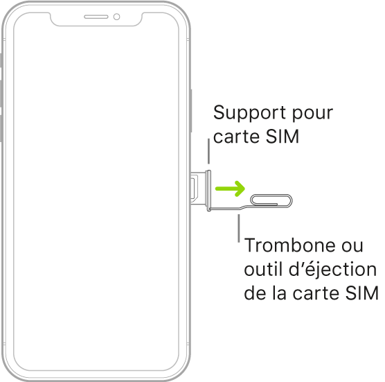 1. Insérez un trombone ou un outil d’éjection de carte SIM dans le petit trou du support pour carte SIM, puis poussez vers l’iPhone pour éjecter le support.