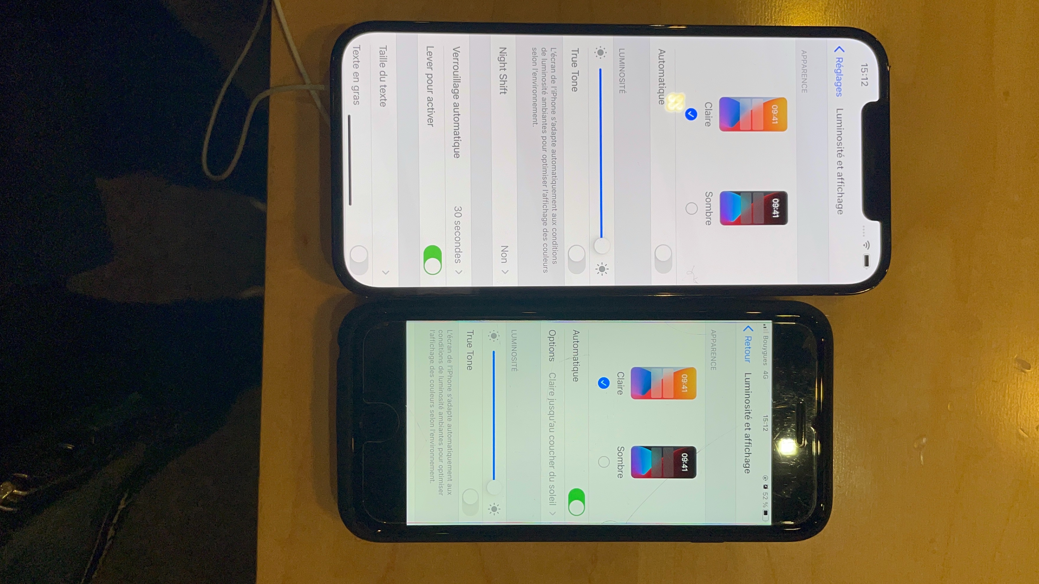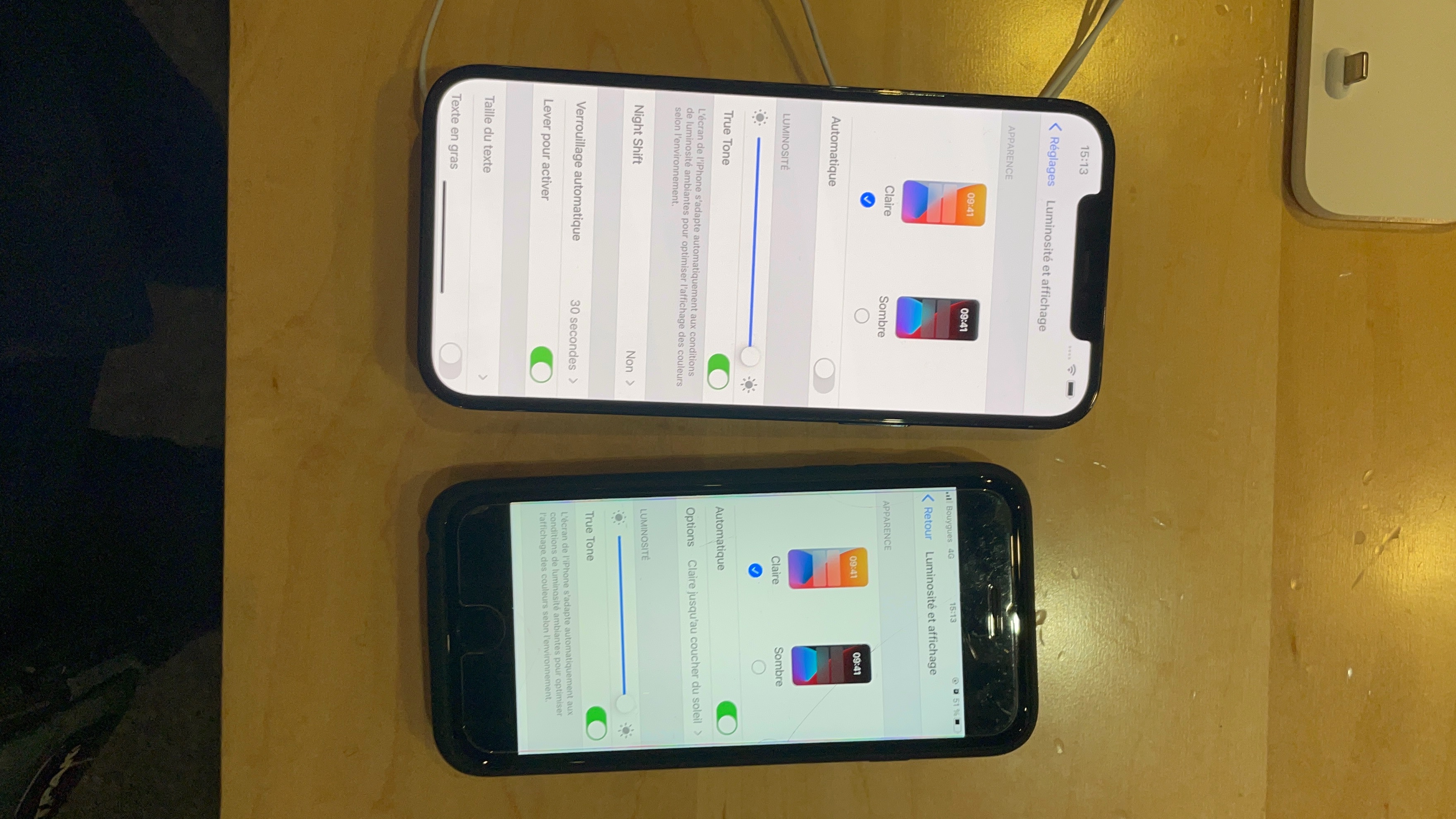 Et là, surprise, nouveau téléphone mais toujours le même problème !! Voir la photo en PJ ! (Nouvel iPhone 12 pro Max à droite, et iPhone XS Max à gauche). C’est une honte ! J’ai même dû l’envoyer à Apple pour justifier ma bonne foie !! Je rappel donc Apple et rebelotte, on me propose un échange à neuf ! J’en peux plus de toute ses démarches ! Sans oublier qu’au prix du téléphone je trouve cela inadmissible ! Je suis même allé ce jour comparer mon modèle d’iPhone avec ceux en exposition chez boulanger et la Fnac et m’aperçois qu’en plus d’avoir un écran encore plus jaune que ceux présenté dans ces magasins, ma luminosité était très faible par rapport aux iPhone de présentation !