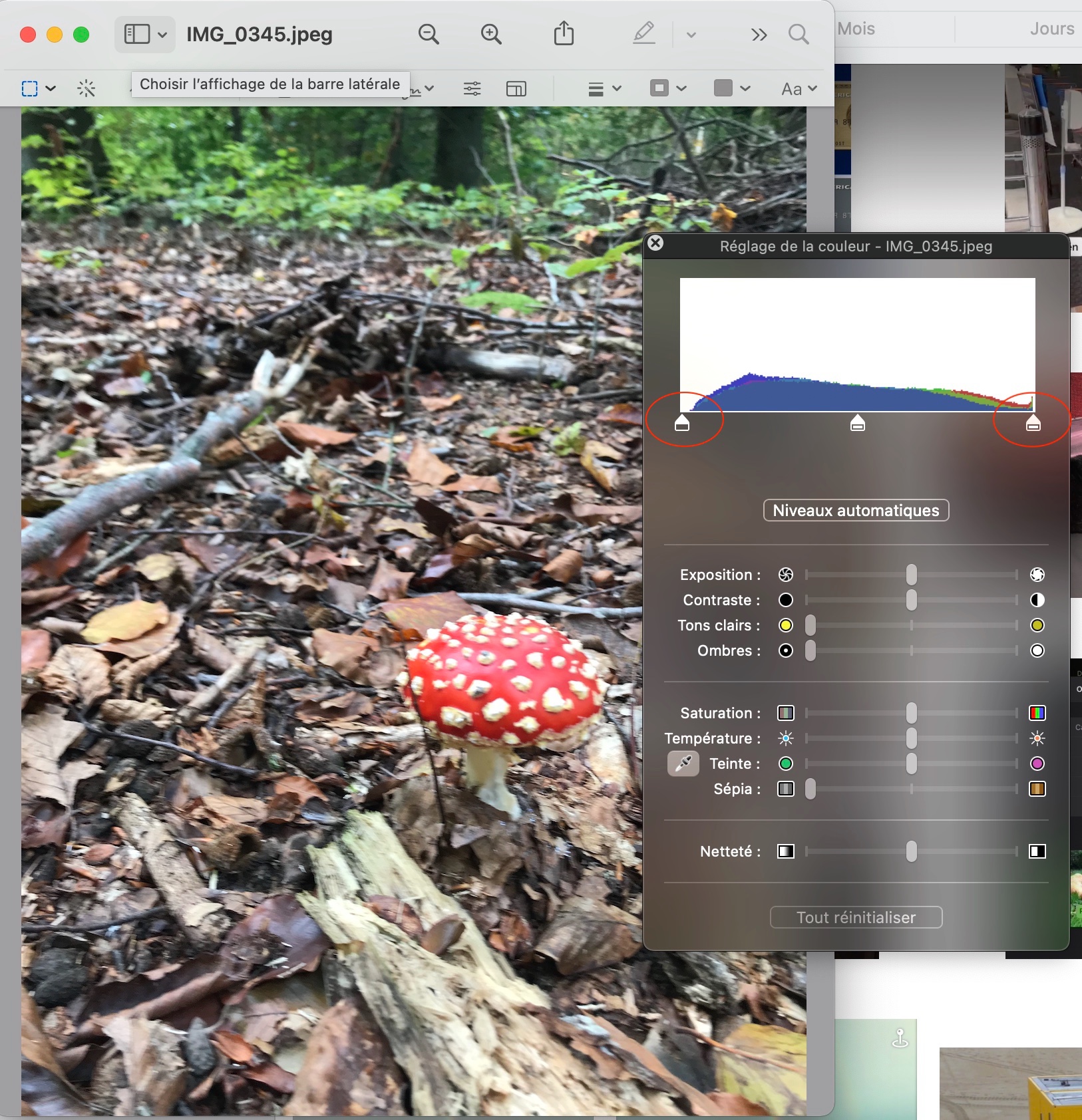 Pour passer du négatif au positif (ou l'inverse), il suffit d'ouvrir la photo dans Aperçu, aller dans Outils/Réglages de la couleur/. et là, vous inverser le noir et le blanc. Il faut faire glisser le curseur de gauche à droite et le curseur de droite à gauche, comme ci-dessous.
