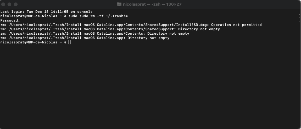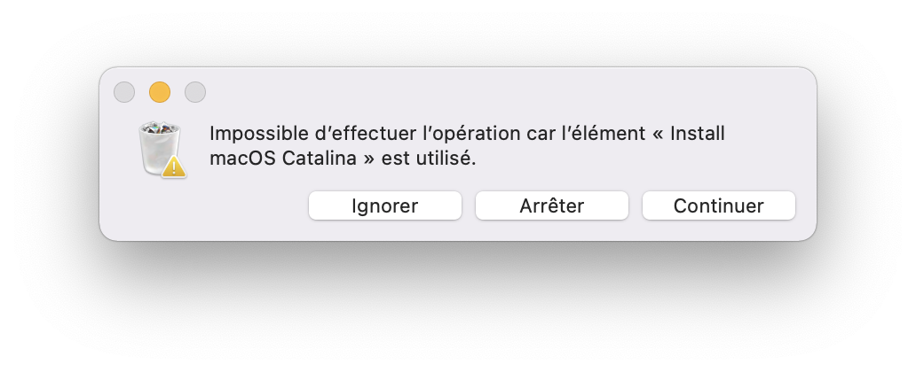 Bonjour, j'ai ce fichier (Install macOS Catalina) dans ma corbeille qui est impossible à supprimer car "Impossible d’effectuer l’opération car l’élément « Install macOS Catalina » est utilisé."