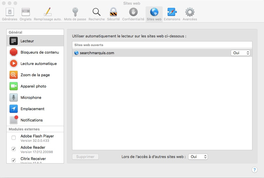 J'ai redémarré l'ordinateur mais rien n'y fait : dès que je vais sur Safari ou Google chrome, la page d'accueil est searchmarquis. Il n'y a que sur Firefox que je n'ai pas (encore) ce souci...