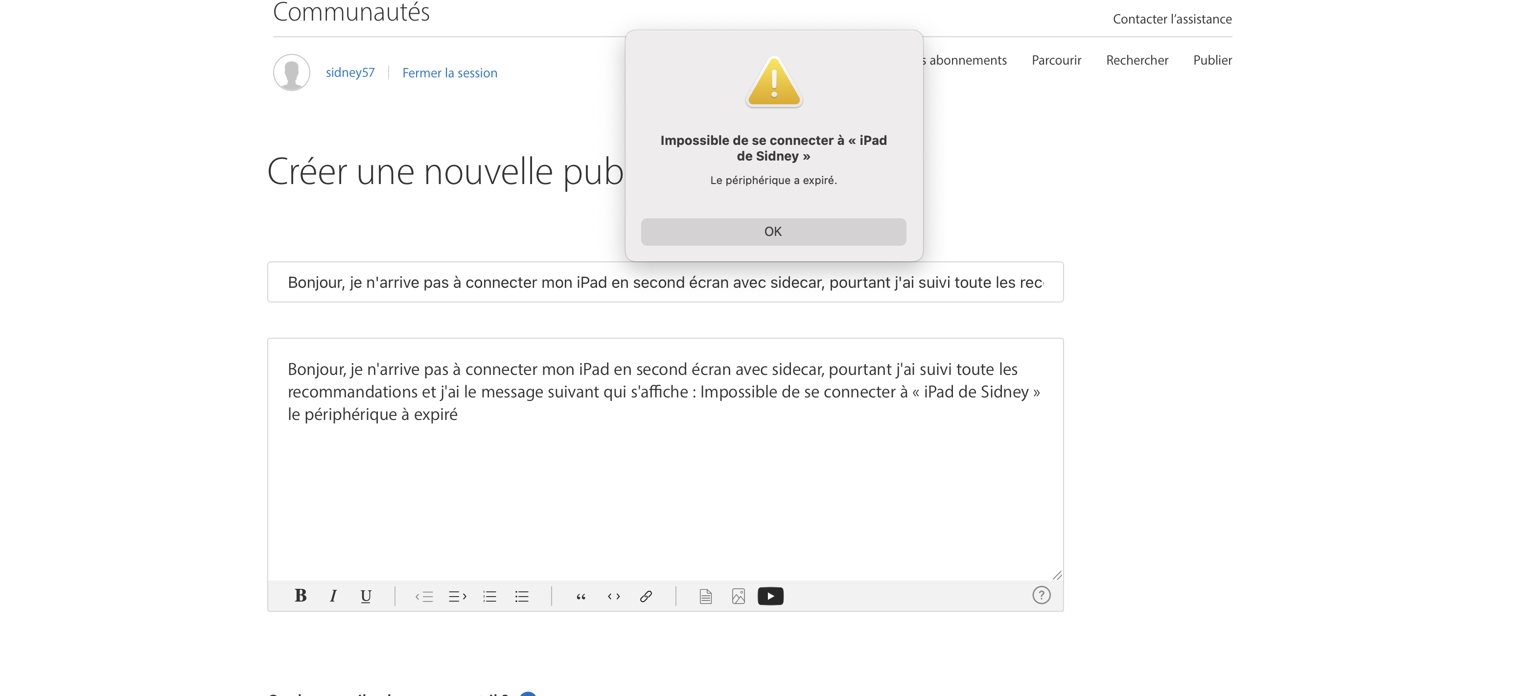 Bonjour, je n'arrive pas à connecter mon iPad en second écran avec sidecar, pourtant j'ai suivi toute les recommandations et j'ai le message suivant qui s'affiche : Impossible de se connecter à « iPad de Sidney » le périphérique à expiré