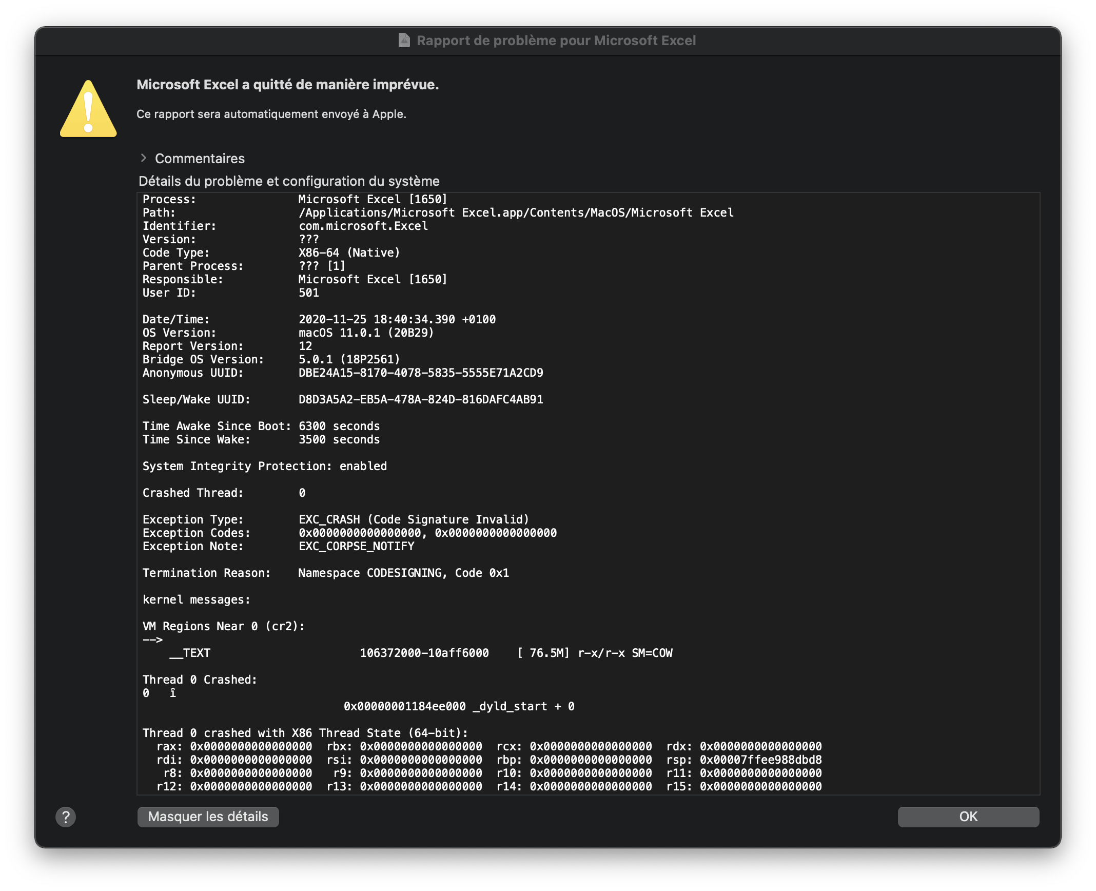 Béotien à mes heures, je rencontre un soucis sur mon iMAC (2020) à savoir que aléatoirement lorsque je démarre mes applications du pack Microsoft Office 365 (à jour). il arrive que cela soit assez long et se termine par un message d'erreur suivant. Je précise que cela se produit très aléatoirement et ce depuis la récente mise à jour sur Big Sur. A la seconde tentative d'ouverture : aucun problème cela démarre et je peux travailler dans mes application Je suis assez novice sur MAC (personne n'est pas parfait !).