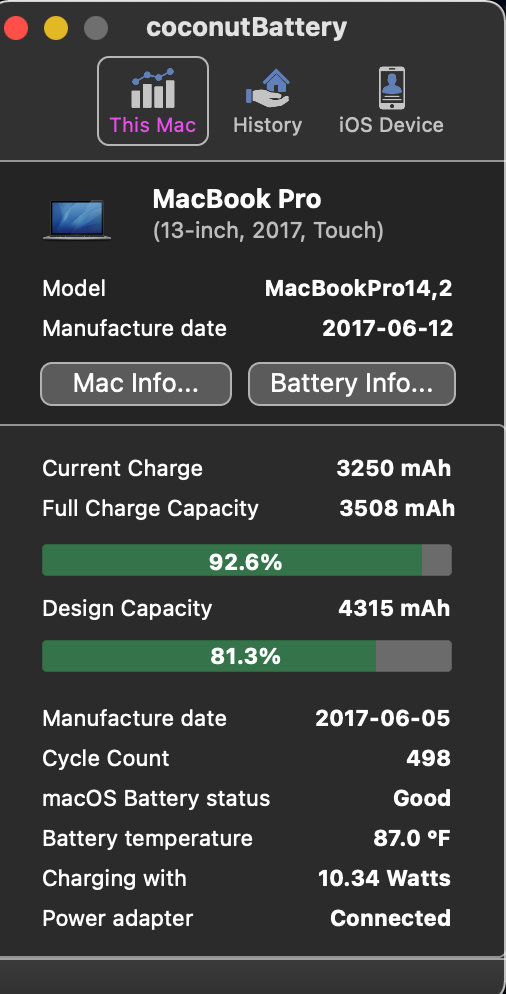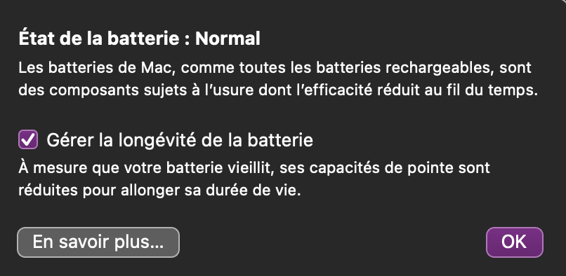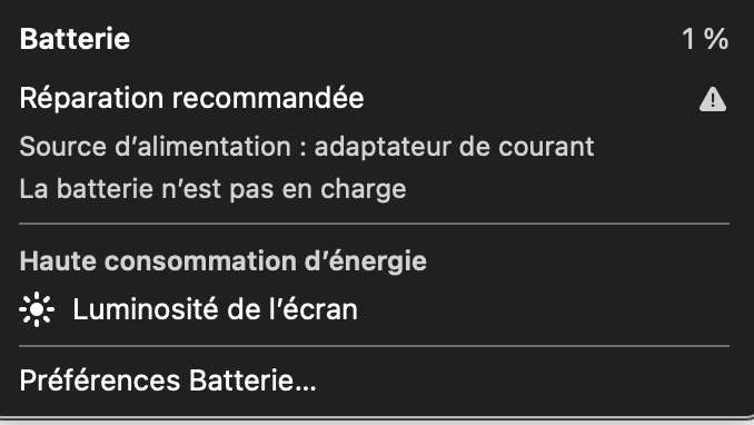 Ce matin, je me réveille, je l'ouvre, et il m'affichait qu'il avait besoin du chargeur pour démarrer. (Ce qui était étrange car il était à 100% la veille...) Je le branche, il démarre, et je lance Coconut Battery pour vérifier l'état de ma batterie. (Je le vois à 7% pour l'état de la batterie en ce qui concerne sa santé...) Très étrange, je n'ai pas de capture d'écran, car 1 minute plus tard, il était revenu à sa charge initial...