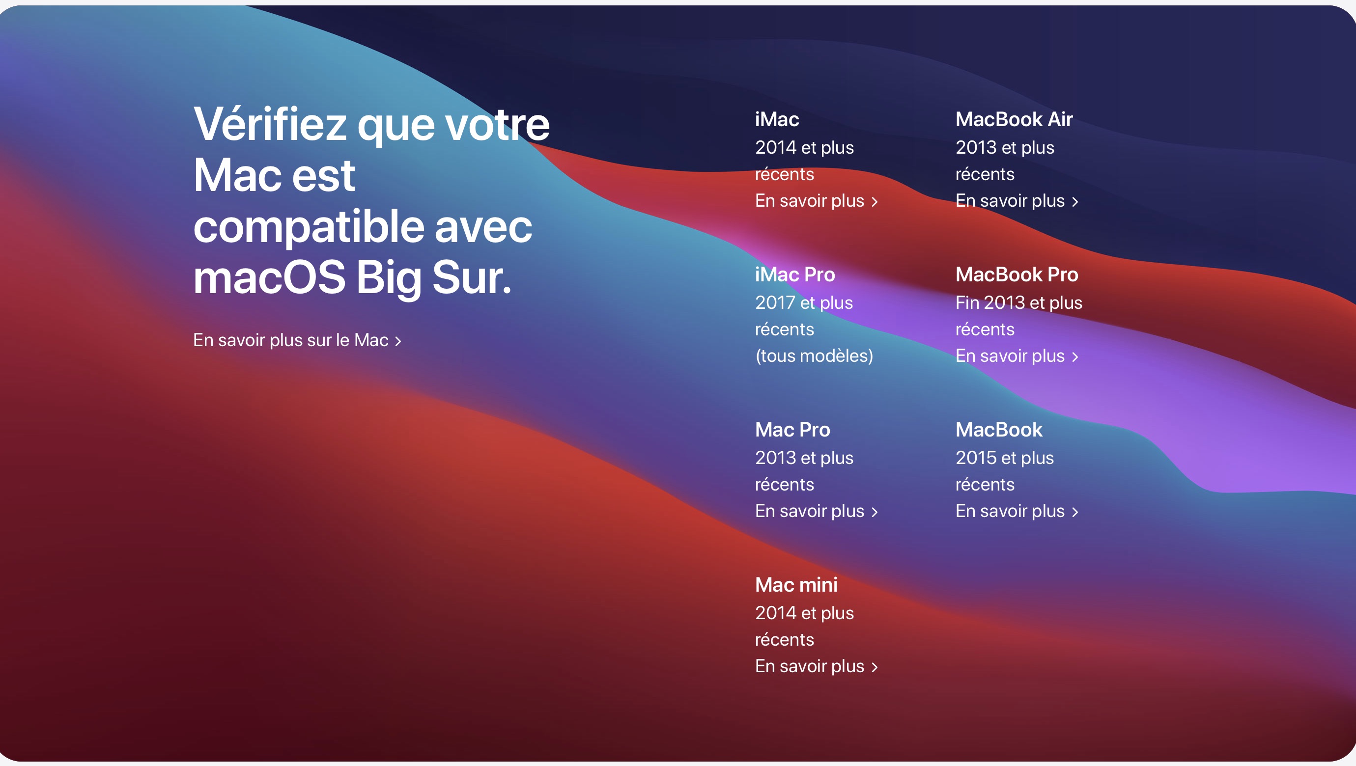 macOS Big Sur est compatible avec les ordinateurs suivants