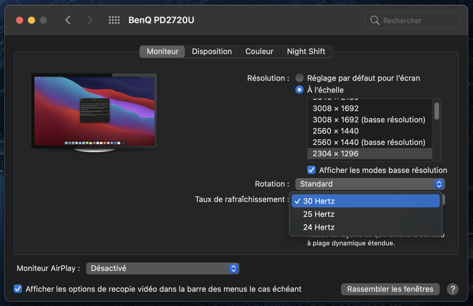 Lorsque je connecte mon MacBook Pro 13 M1 à mon moniteur 4K 27" via le cable Thunderbolt 3 fournir avec le moniteur, le taux de rafraichissement est limité à 30 Hz pour une mise à l'échelle à haute résolution (voir copie d'écran ci-jointe). Le taux de 60 Hz n'est possible que pour certaines basses résolutions.