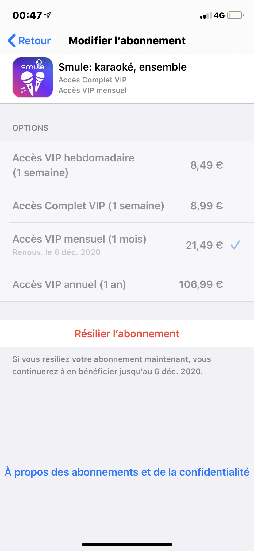 Résilier abonnement Smule dans l'App Store sur iPhone