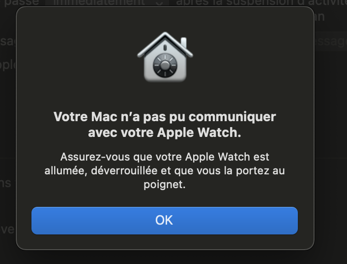 Bonsoir suite à MaJ Big Sur et apple watch 7.1 mon mac ne voit plus l'apple watch et ne se déverrouille plus automatiquement. en allant sur préférence système je coche la bonne case et pourtant le message suivant apparait systématiquement (cf ci-dessous) -->