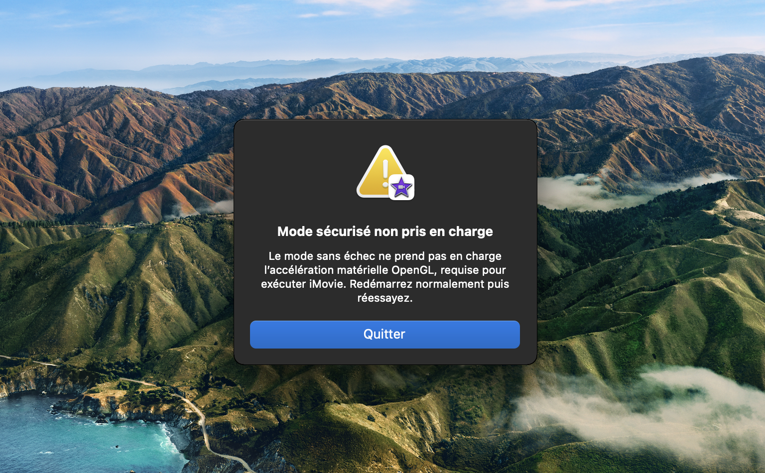 J'ai voulu essayer en mode sans échec aujourd'hui pour trouver une solution à ce code d'erreur, mais iMovie Semble ne pas apprécier le mode sans échec sur ma machine :