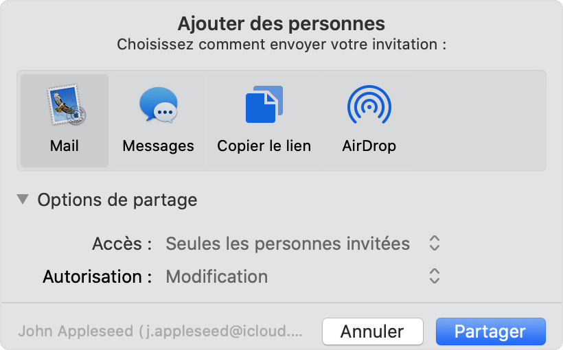 . - Sélectionnez la façon dont vous souhaitez envoyer l’invitation : Mail, Messages, Copier le lien ou Airdrop, par exemple.
