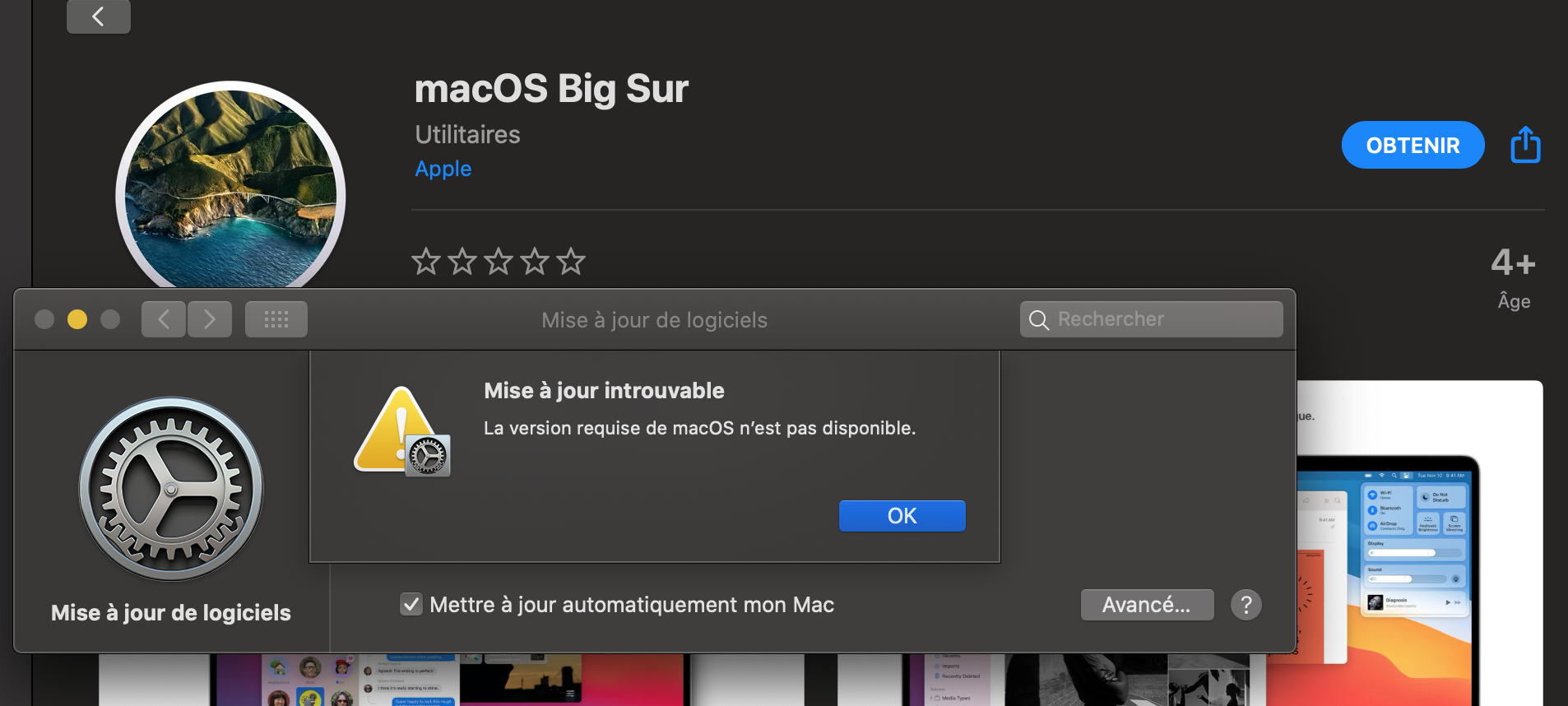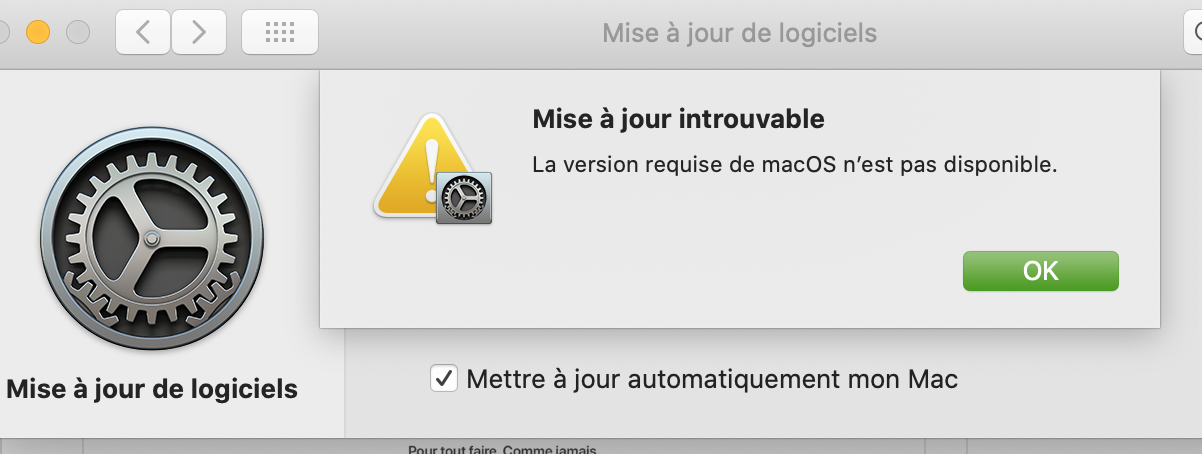 Je vois que le MacBook Pro (Retina, 13 pouces, fin 2013) est dans la liste des ordinateurs compatibles, pourtant impossible d'acceder à la mise à jour via Appstore. J'ai un message disant "La version requise de macOS n’est pas disponible."
